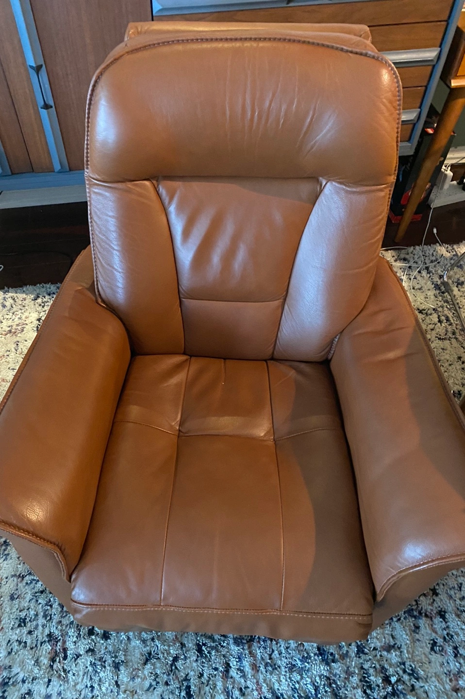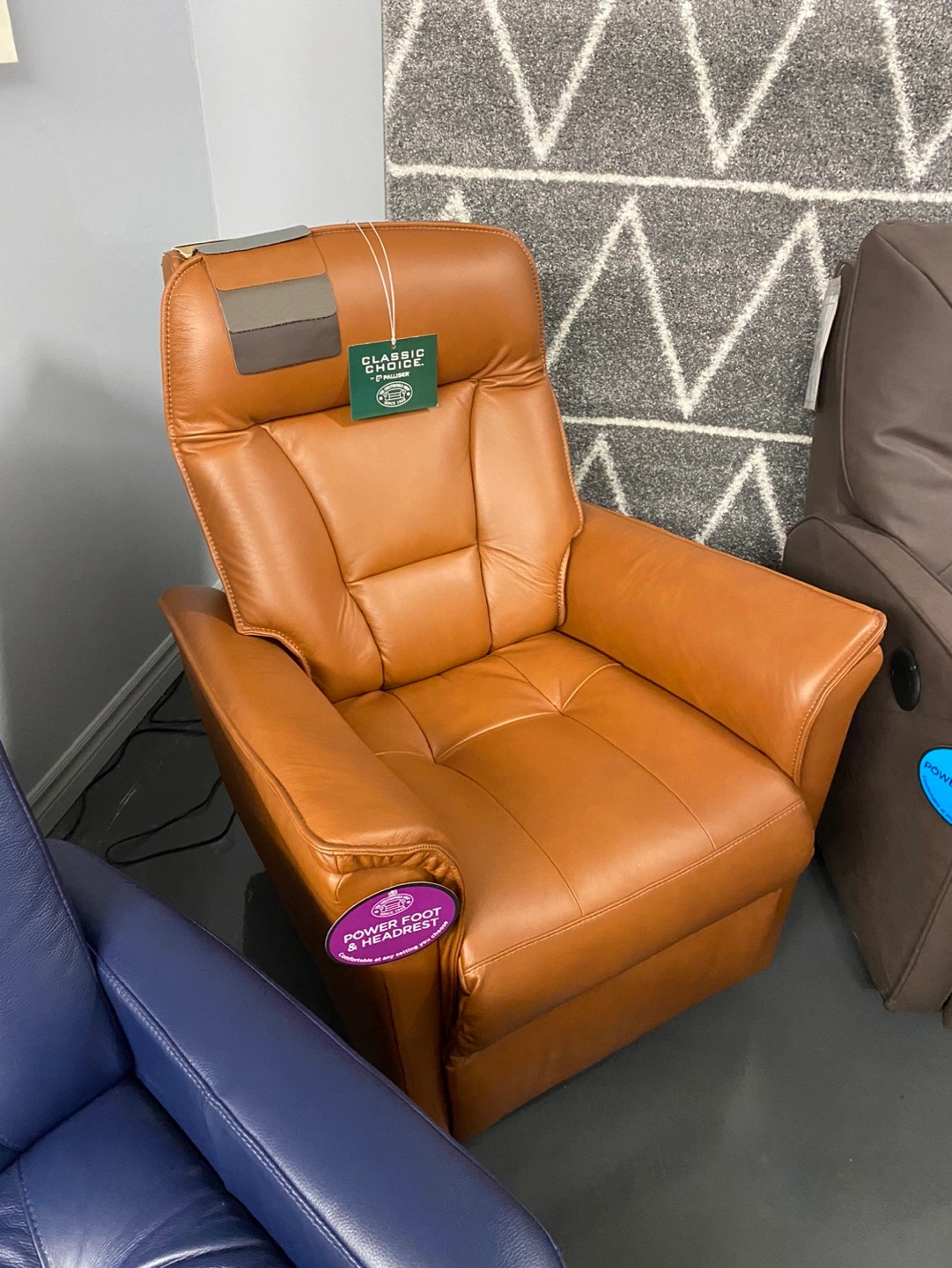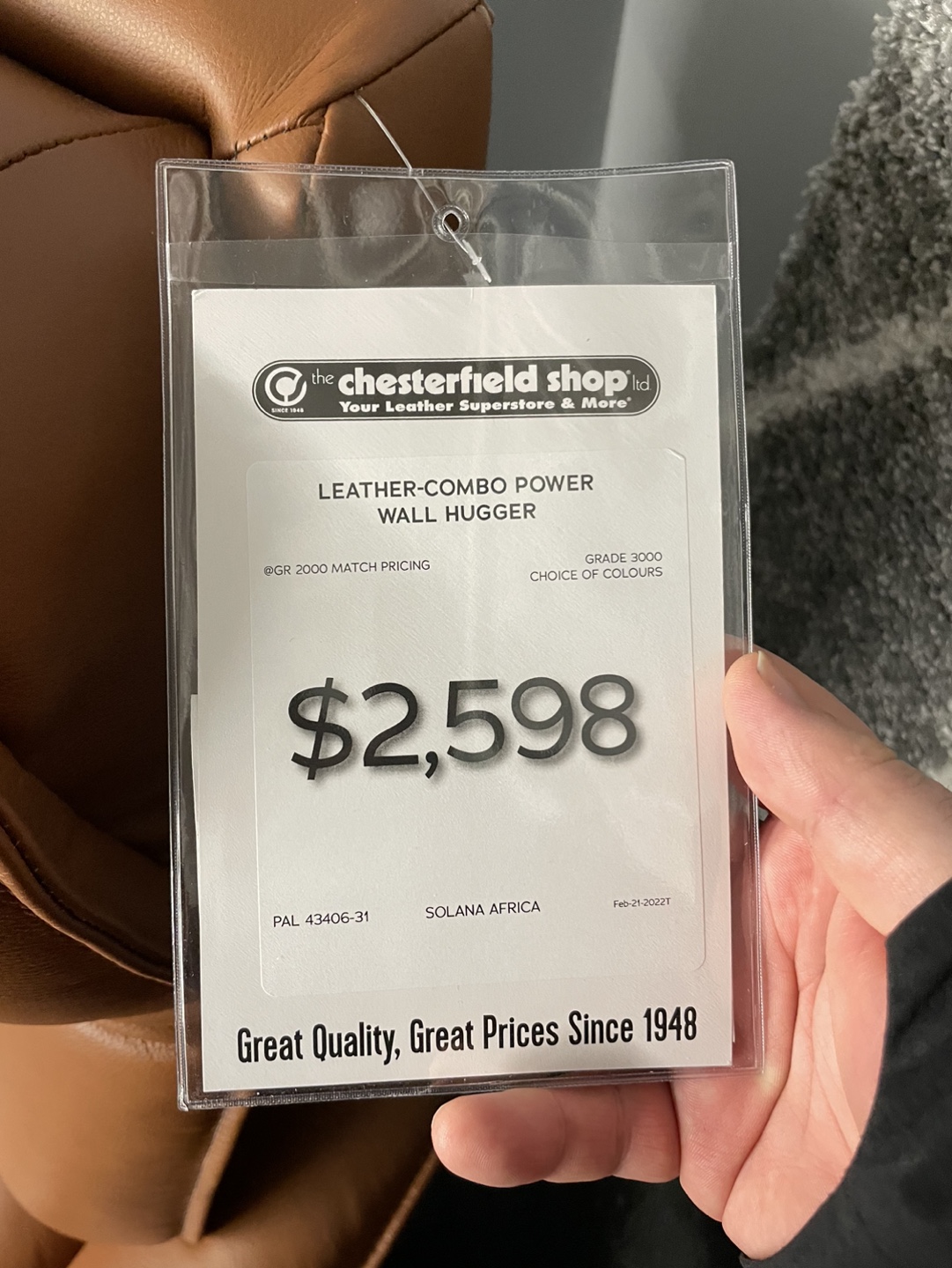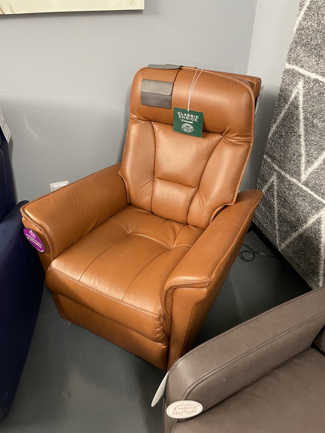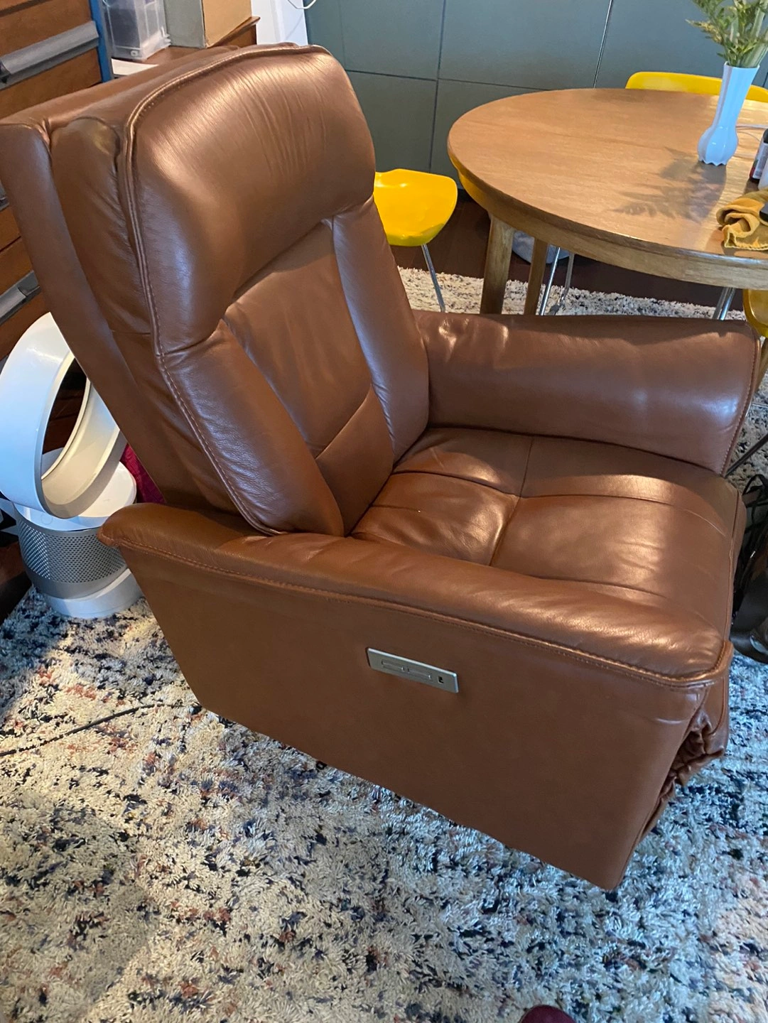 Palliser Power Recliner. Adjustable headrest. USB port so you can charge your phone while you relax. I included photos of the chair in the showroom at its current price. 9.5/10 condition. (Small wear on back corner - photo can be provided) Very comfortable and stylish. Still under warranty at Chesterfield Shop. I can provide the original receipt. So you can make use of the warranty if needed.