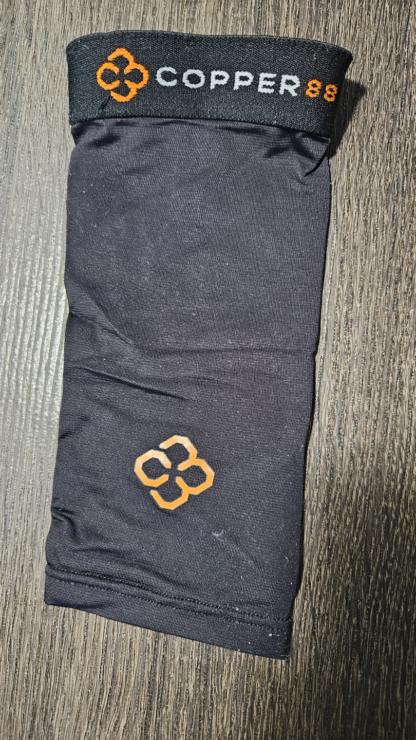 Black copper infused elbow sleeve. Provides some compression and support. Great for sports or everyday use. Gently used.