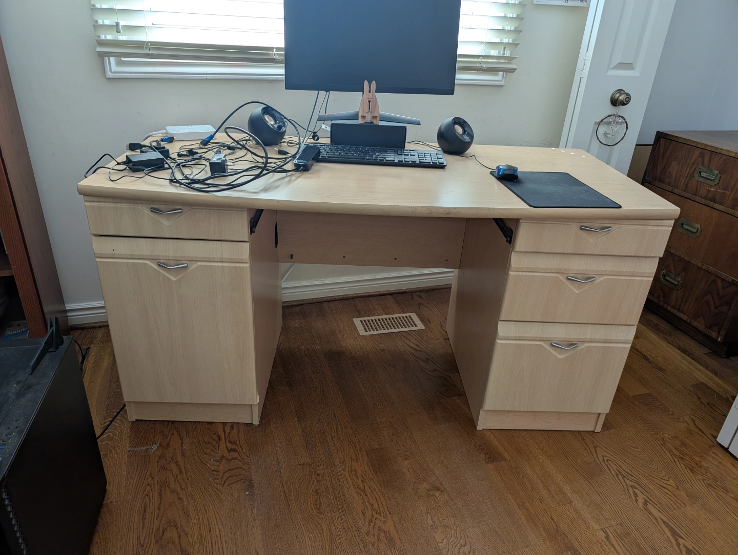 Large computer desk, light wood finish. Features multiple drawers and a cabinet. Good for home office or workspace. Some minor wear. Comes with keyboard tray and monitor stand (not pictured). Dimensions are: 58Lx26Wx30H