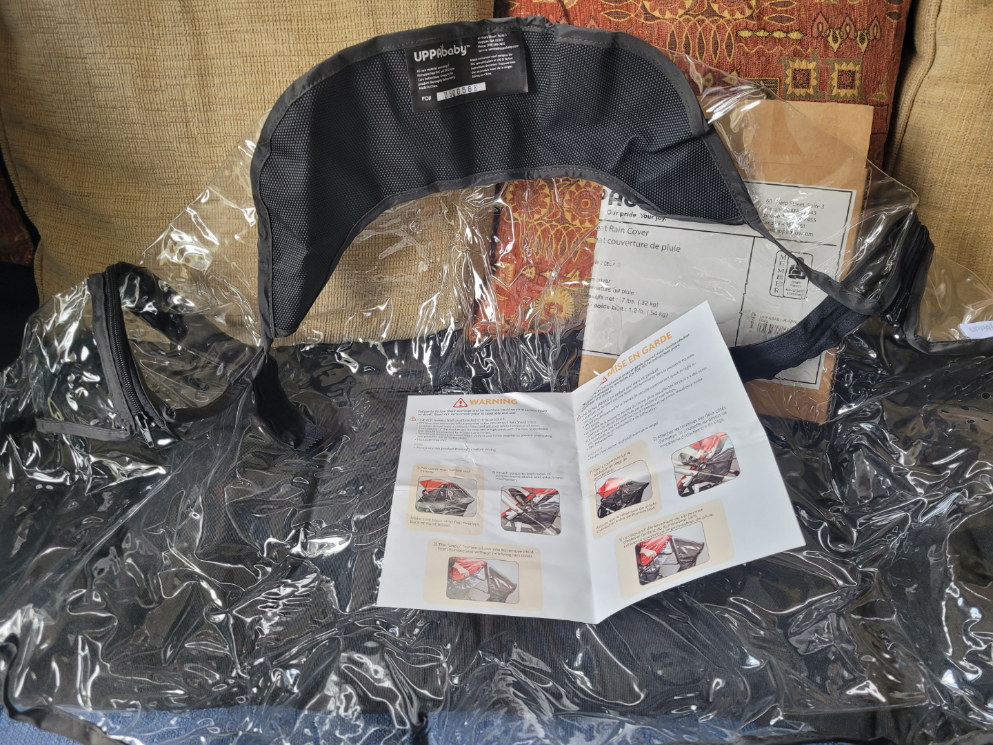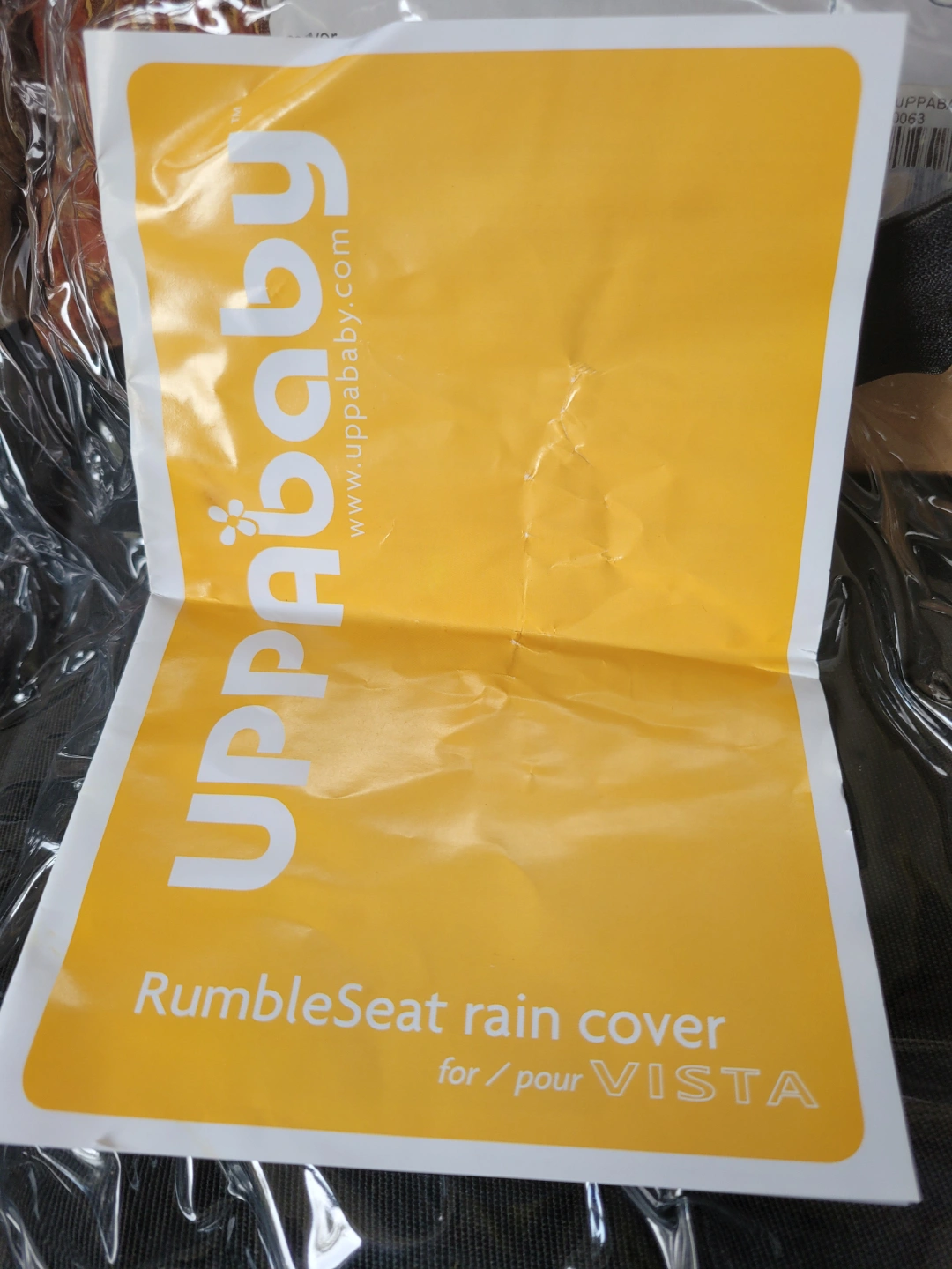 Brand new genuine UPPAbaby RumbleSeat rain cover for Vista / Cruz stroller. Clear plastic cover. Includes instructions. Phthalate-free PVC and nylon.