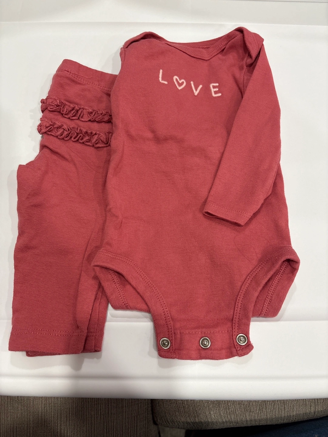 Adorable two-piece outfit for baby girls. Features a mauve bodysuit with embroidered "LOVE" and a pair of mauve leggings with a ruffled detail.