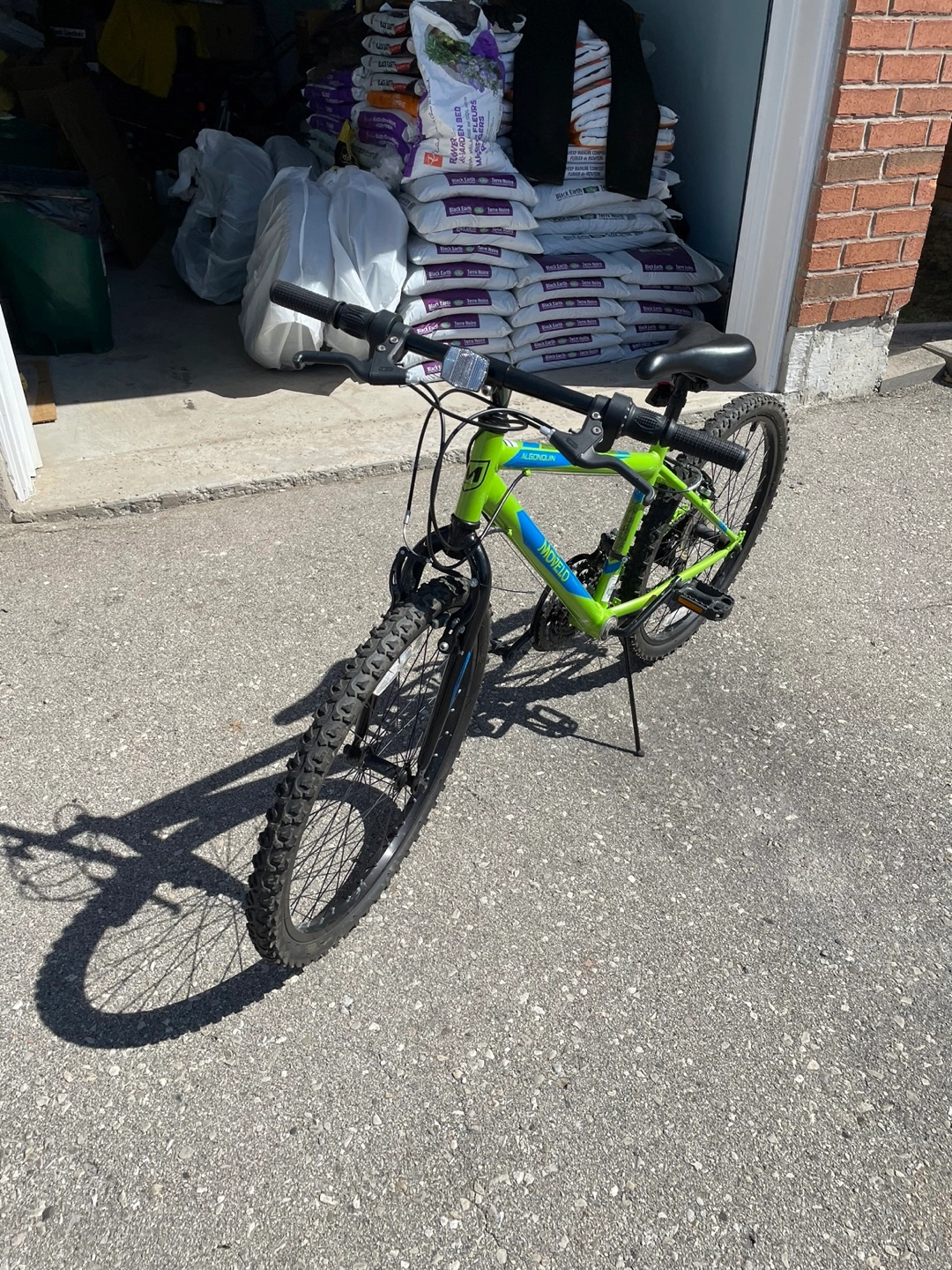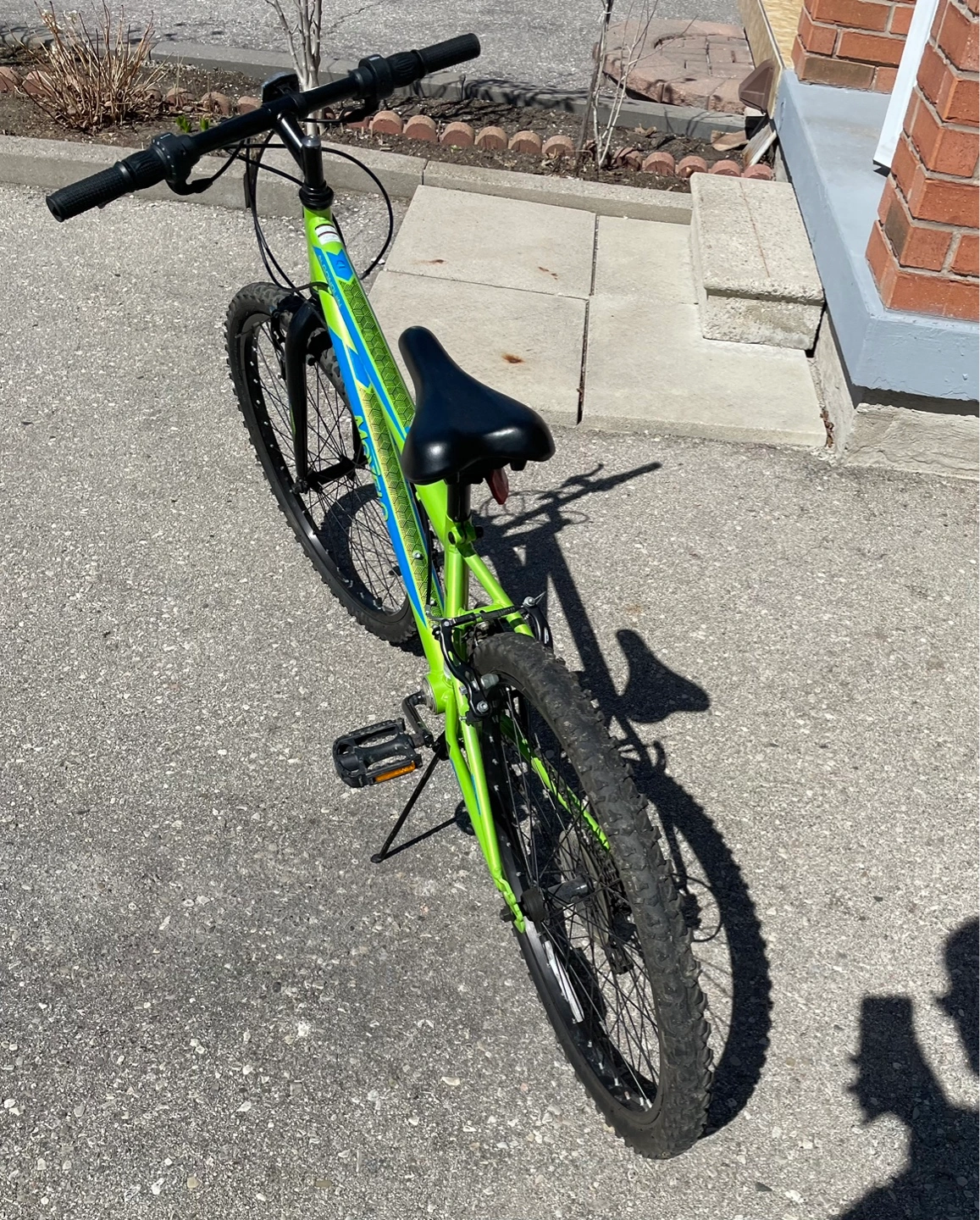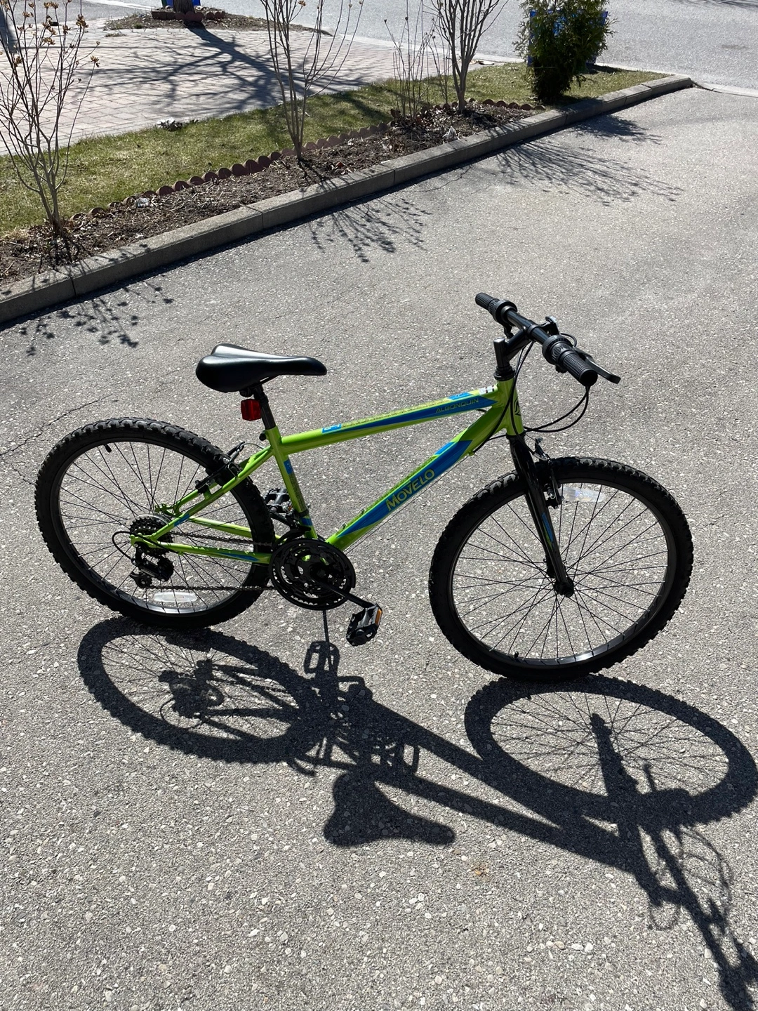 Lightweight mountain bike. Great for kids. Lime green frame with blue accents. 24-inch wheels.
