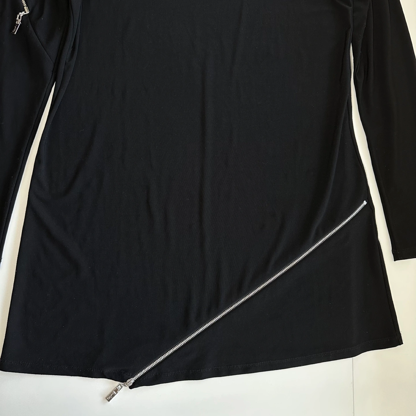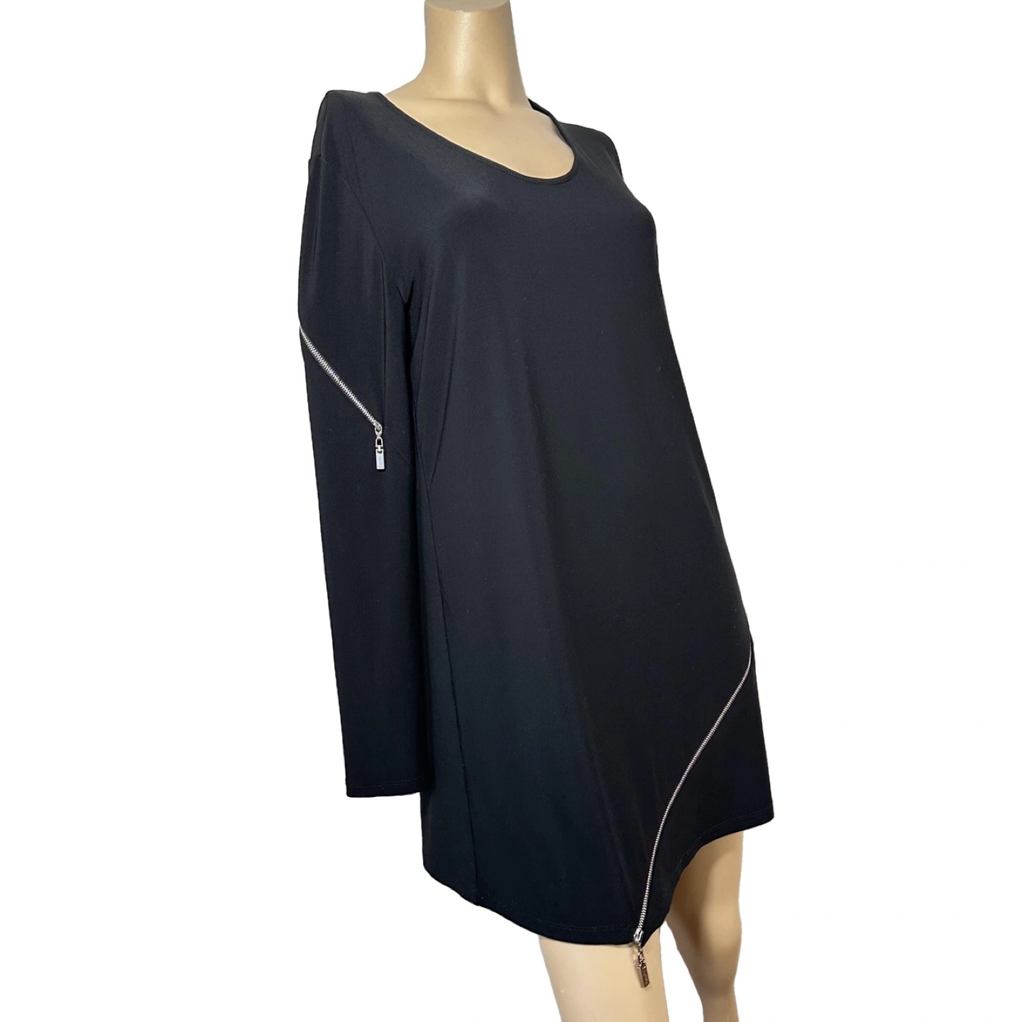 Black tunic top. Asymmetrical hemline. Long sleeves with zip detailing. Scoop neckline. Size 10.