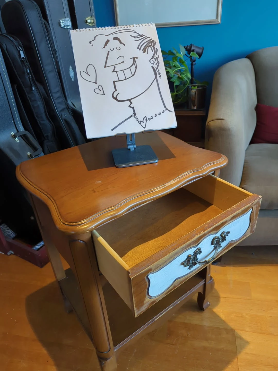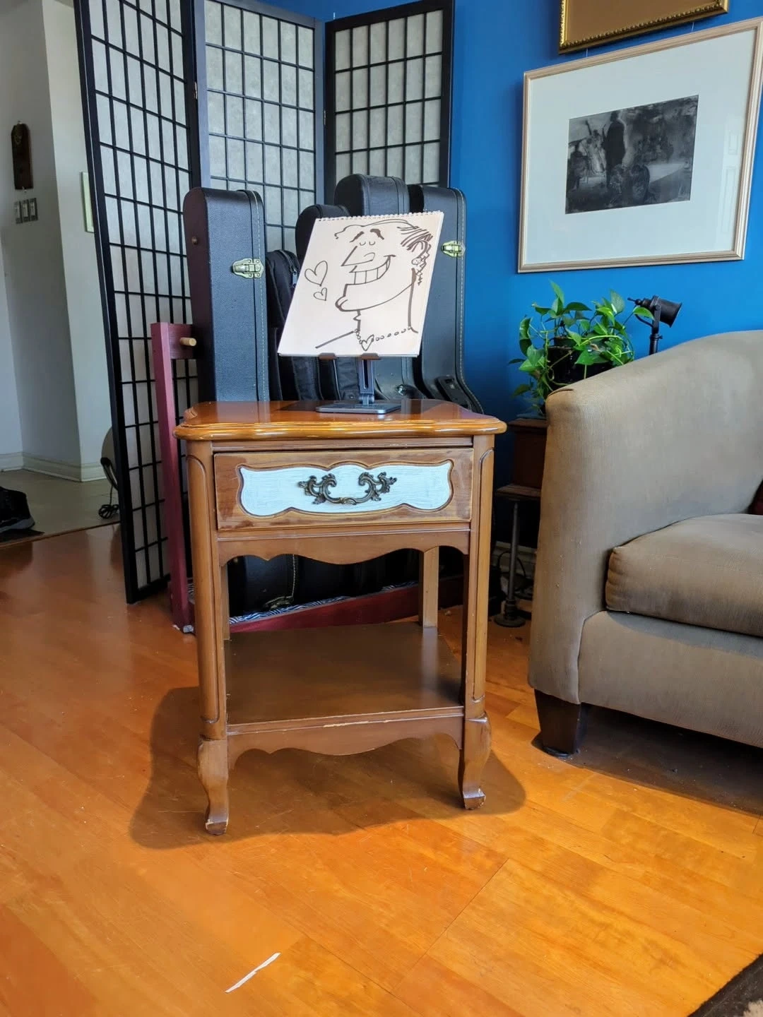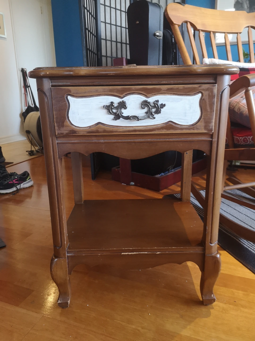 Take this guy home today! Small wooden night stand with painted drawer. Ornate drawer pull. Perfect for a bedroom or living room. (Note: paint is white, but looks blue in photos) Pick up only, please.