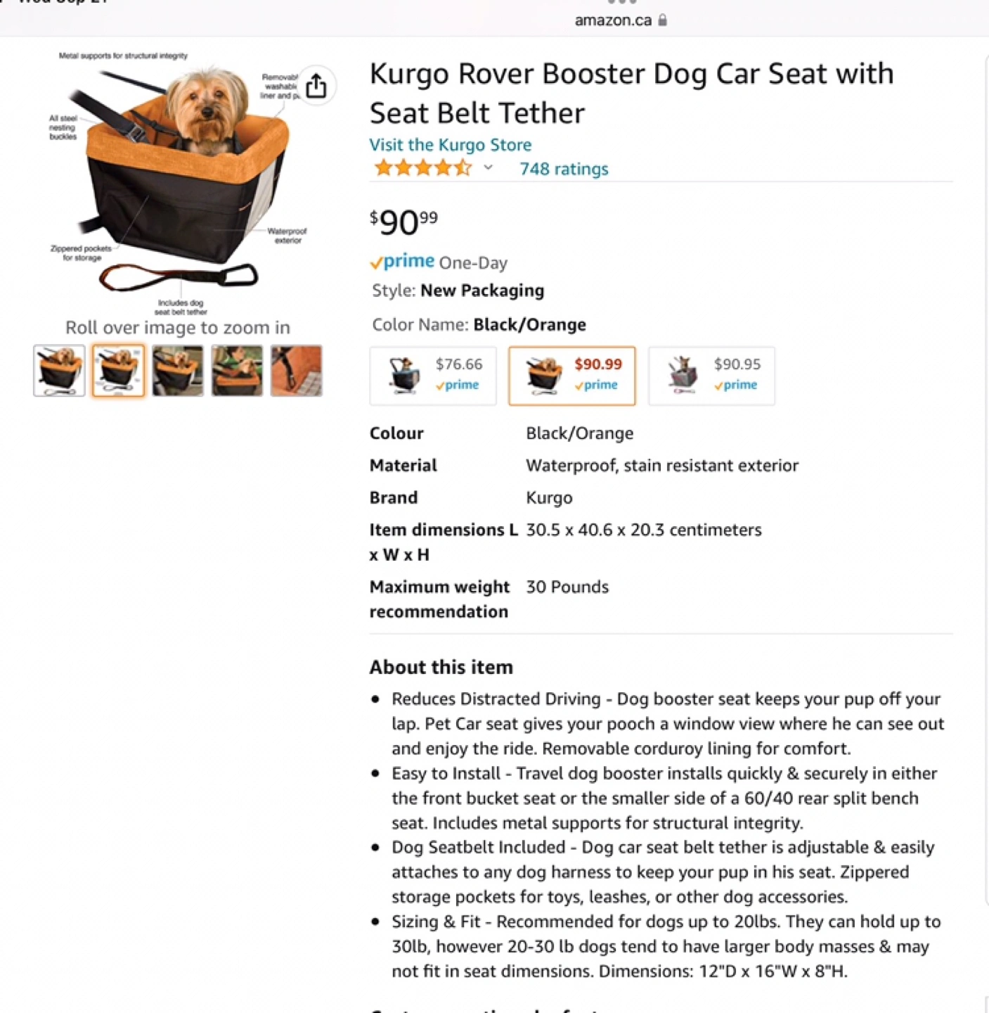 Good condition Kurgo car seat for small dogs and cats. See the third photo for all the pertinent details and how to use the car seat. It has been used a few times, and each time my dog settled down and slept for most of the trips. I no longer have a car, so I must retire this seat