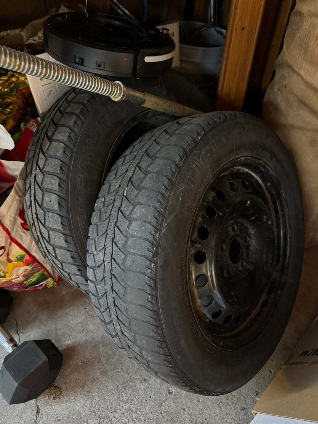 42Set of two used winter tires mounted on rims. Shows wear. Good for a spare.