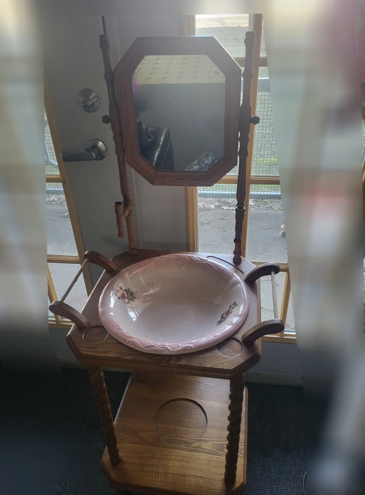 I inheritated an antique washstand with a pink porcelain basin with floral detailing with a mirror. Excellent for bathroom vanity or display. I am open to offers and trades for this