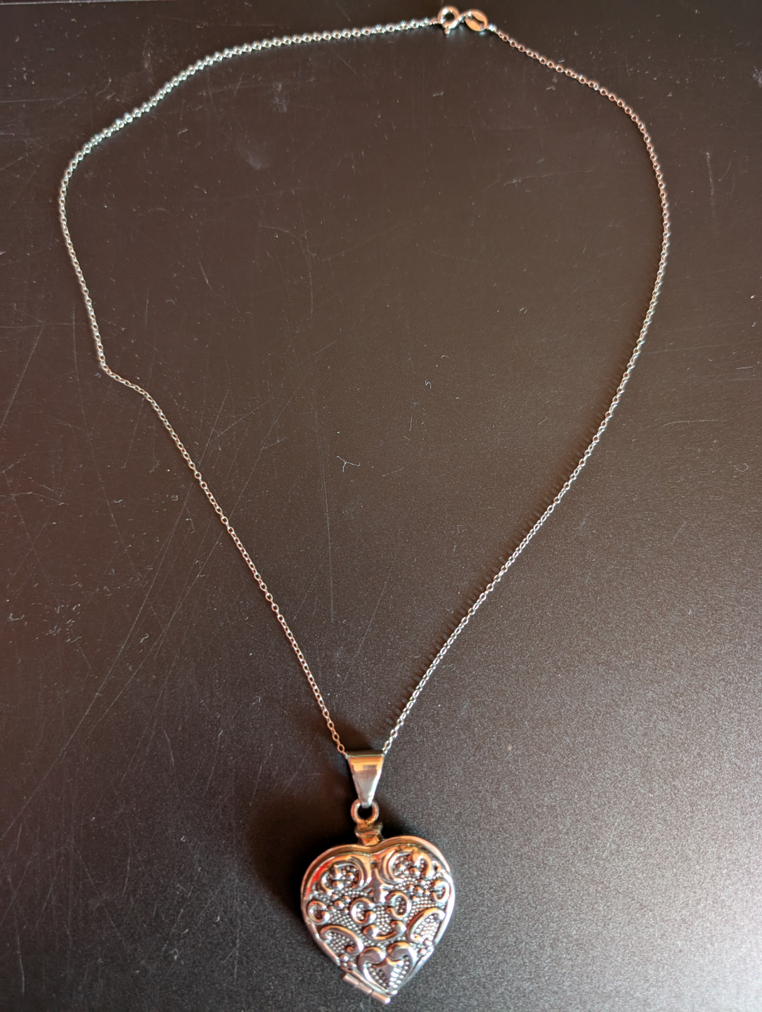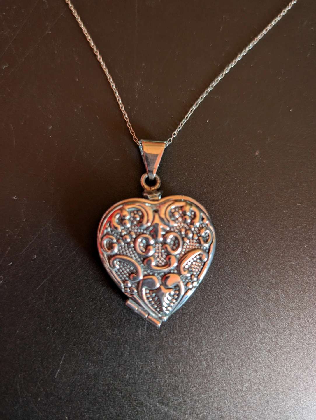 Silver chain included. Opens to reveal a small compartment.