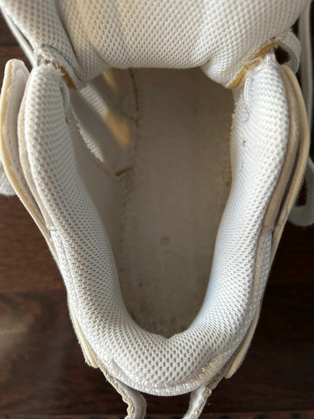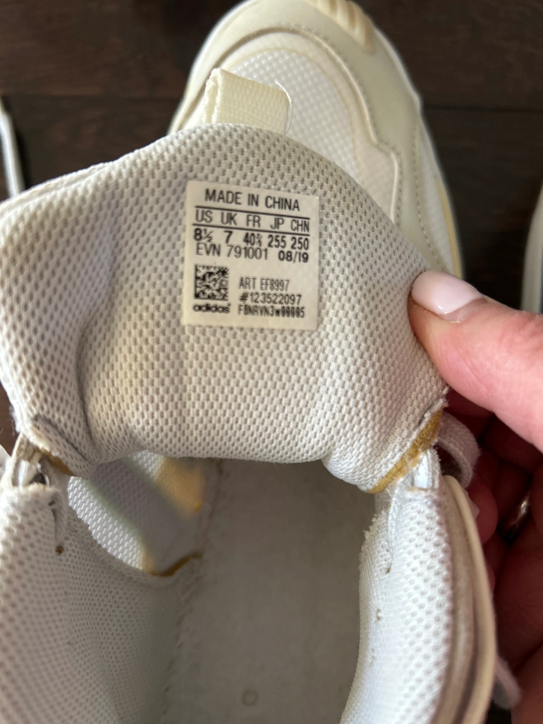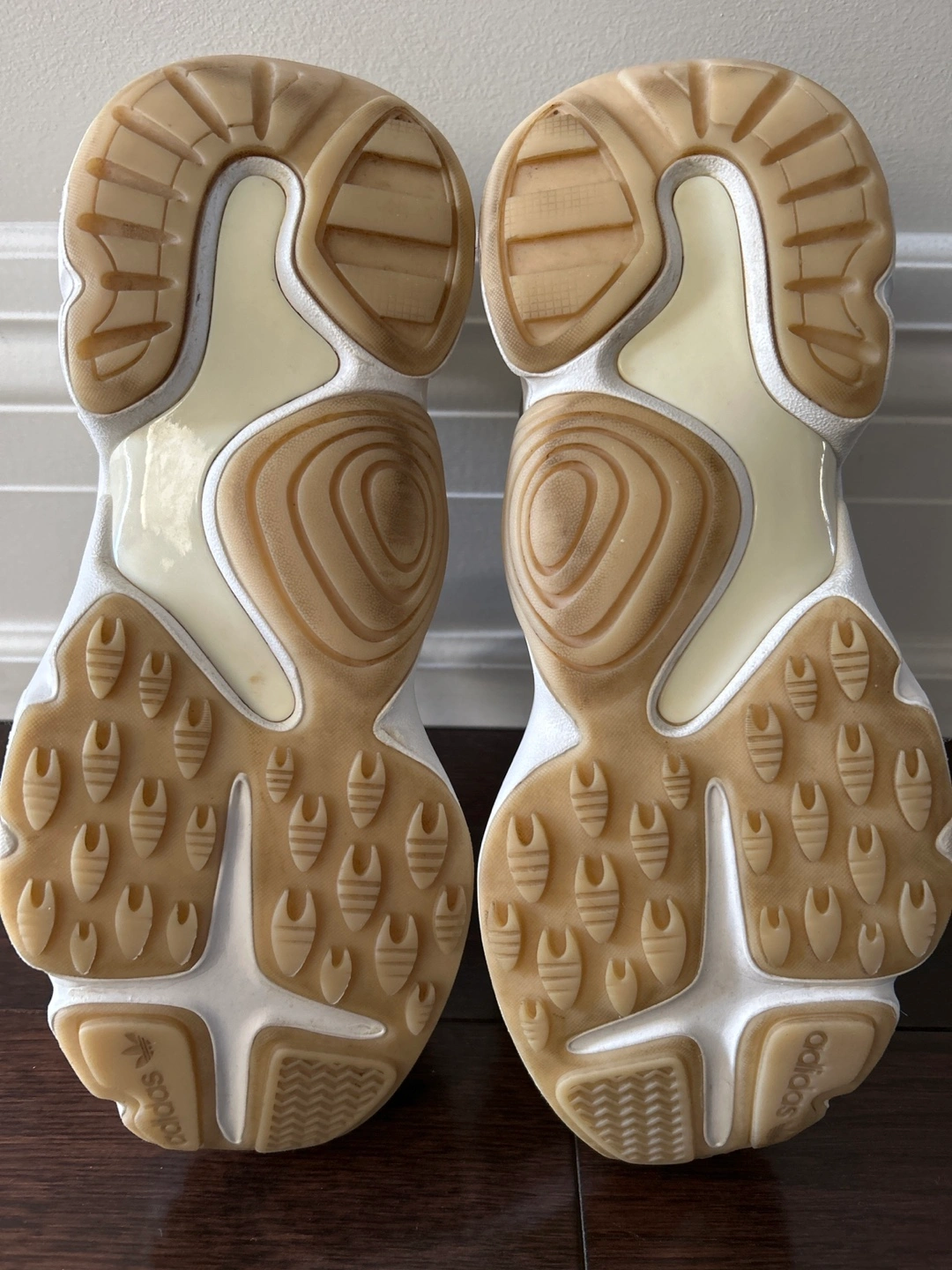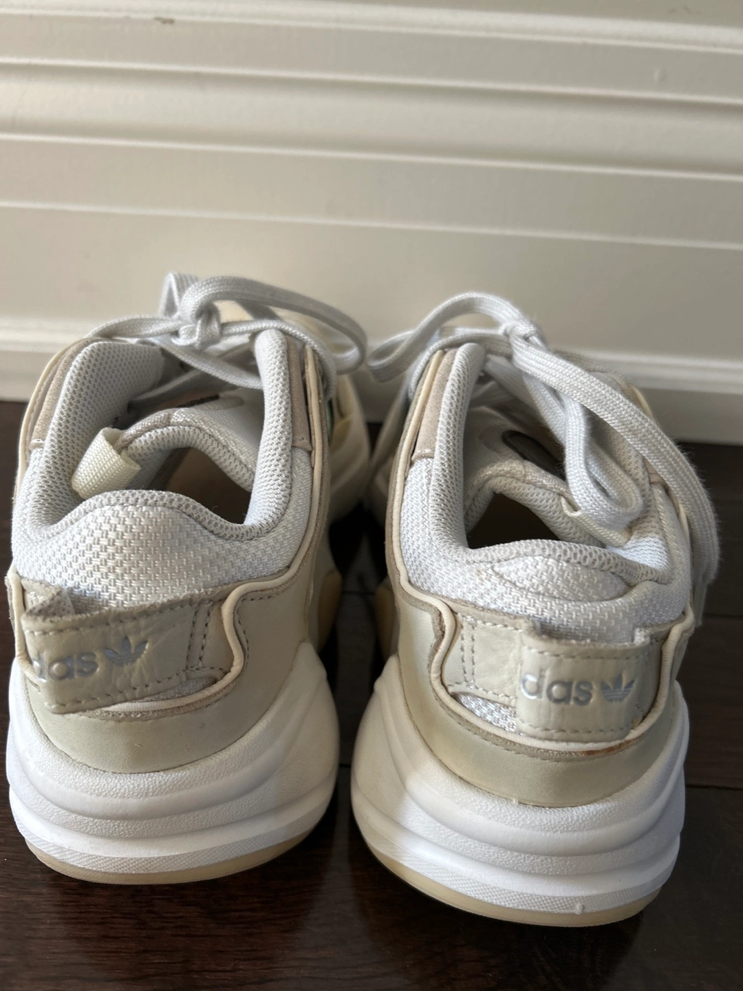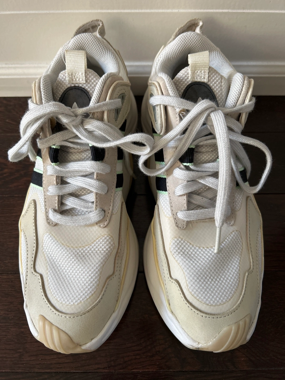 246Cream and white coloured Adidas sneakers. White laces, black and light green accents. Chunky sole. Size 8.5 US. Worn only a few times. Washed and cleaned. Buy your own insole.