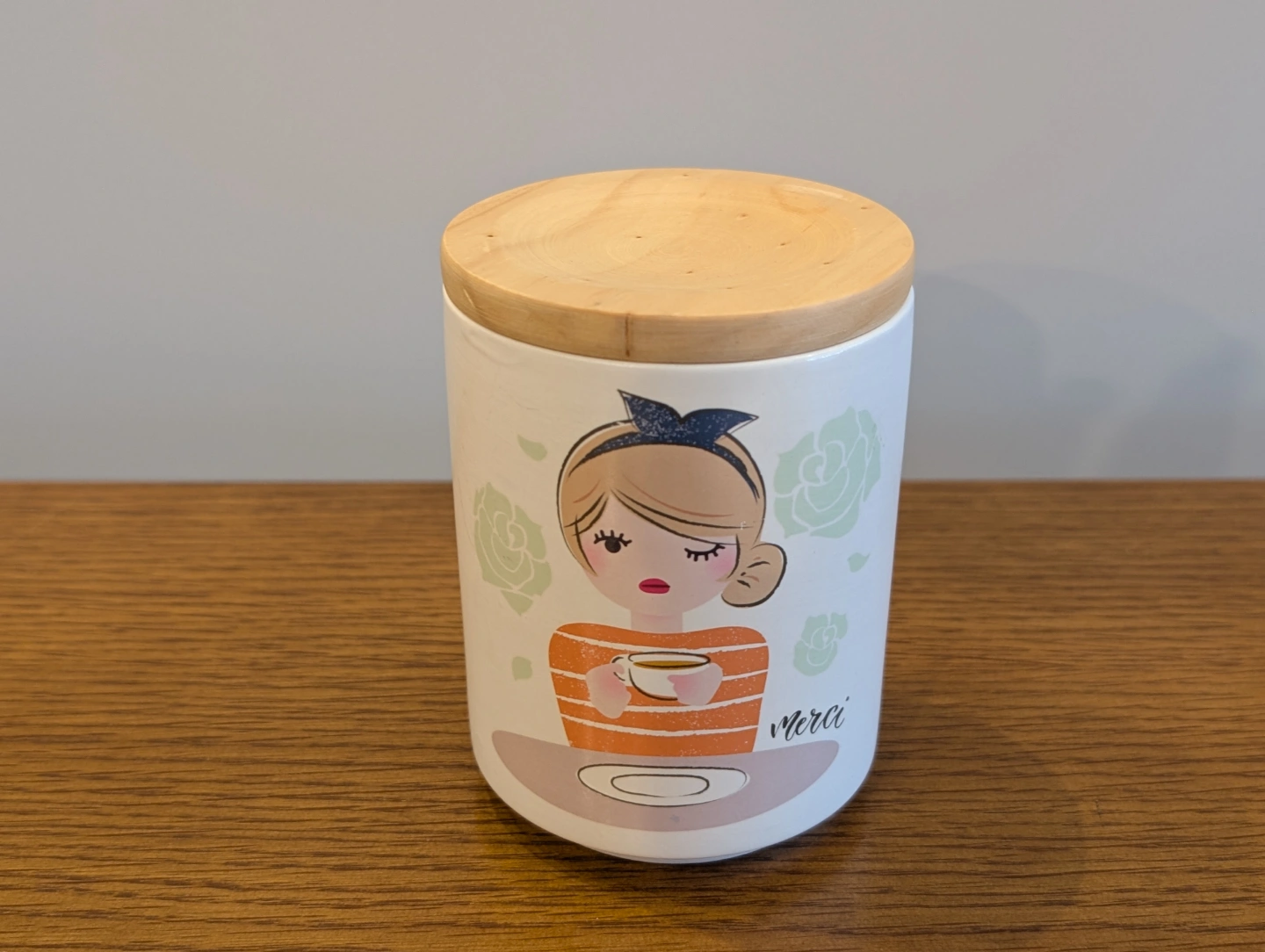 Adorable ceramic candle featuring a charming illustration. Wooden lid included.