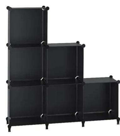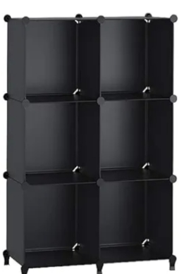 Modular shelving unit. Six individual cubes. Connects easily. Great for closet organization or other storage needs. Black plastic construction. Easy assembly and disassembly.