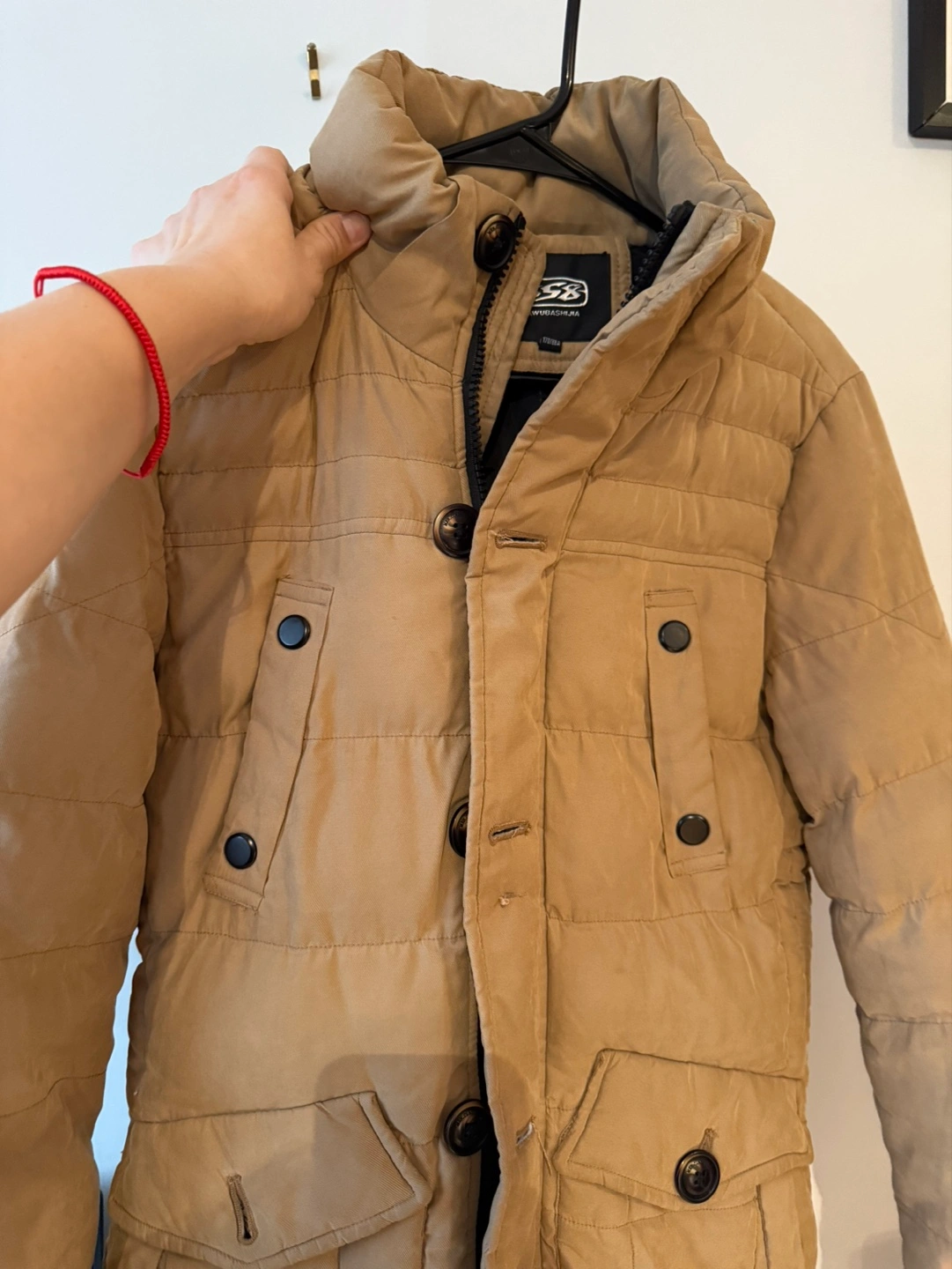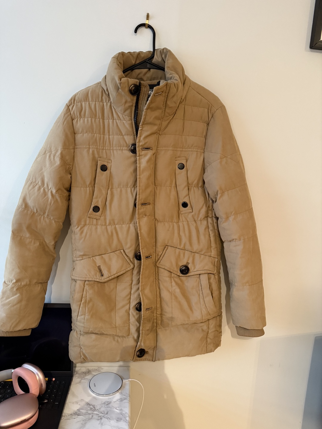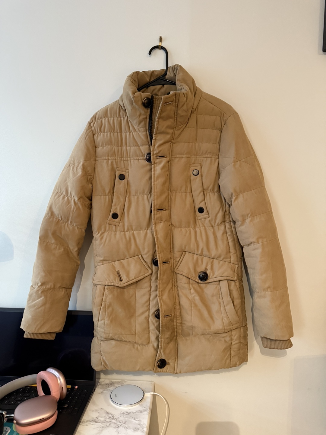 Warm puffer jacket. Beige colour. Snap and zipper closure. Multiple pockets. Good for colder weather.