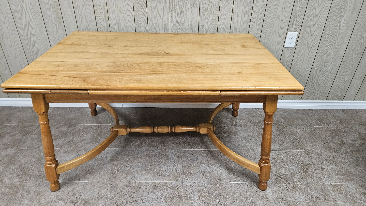Dining table with pull extensions on both ends. 3 feet wide and 4 1/2 feet long; 7 feet long fully extended.