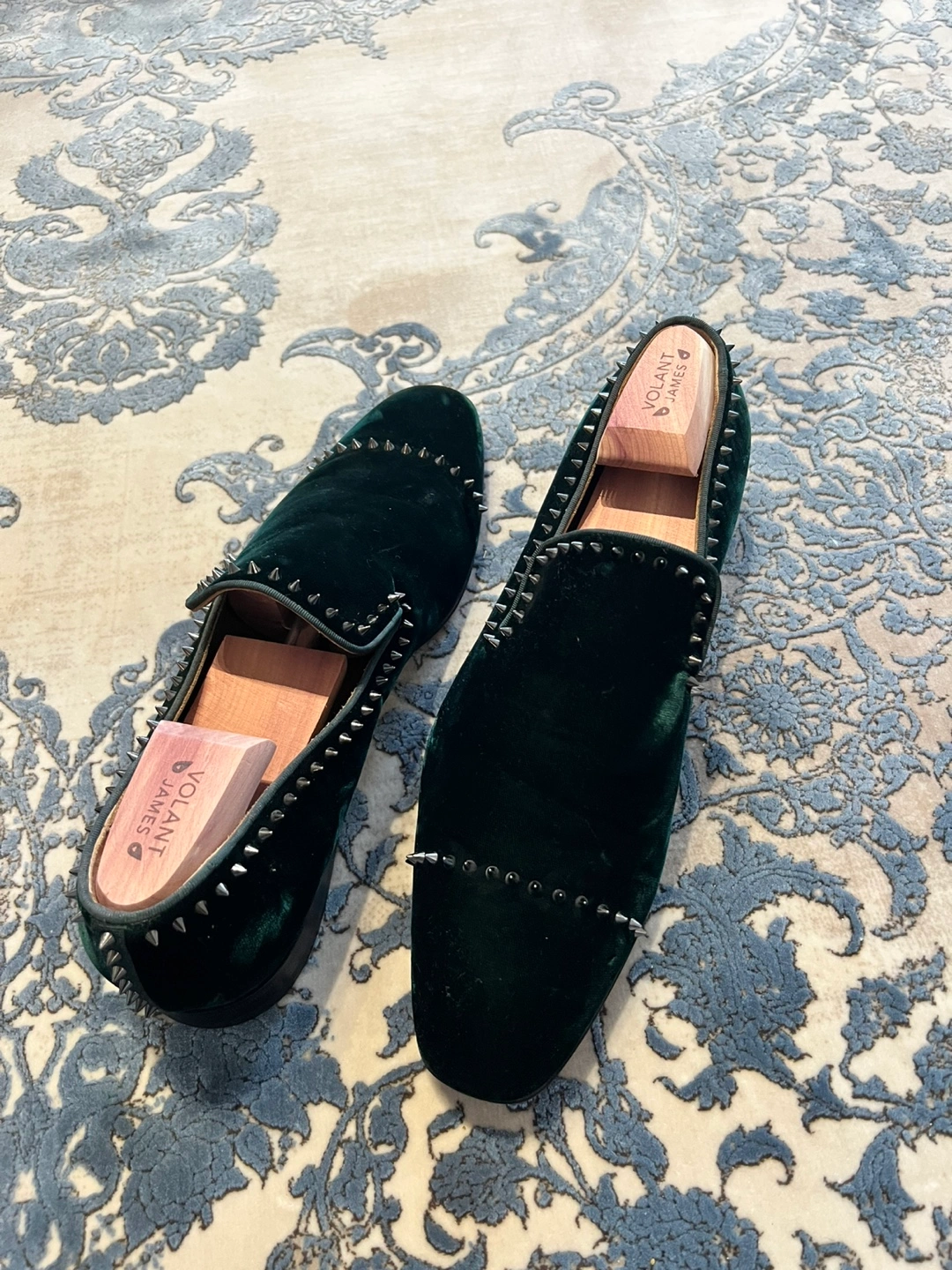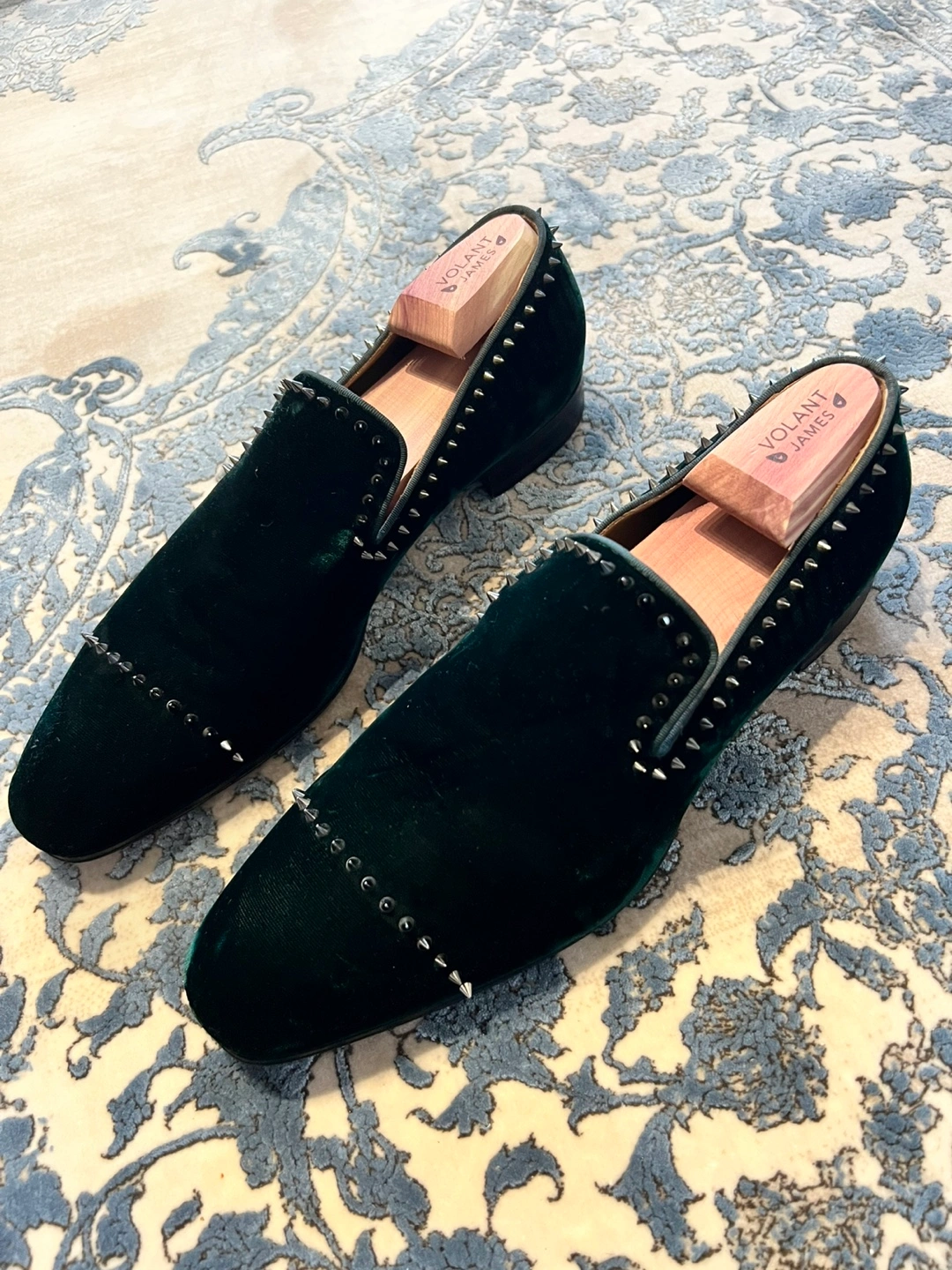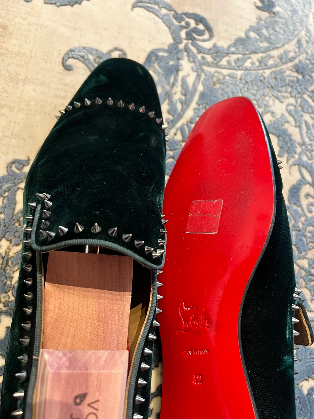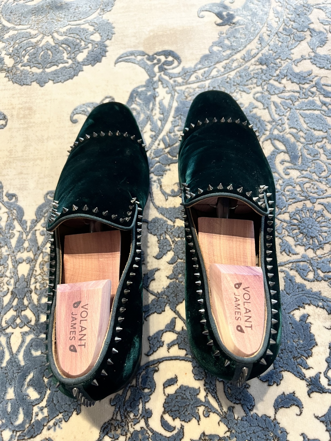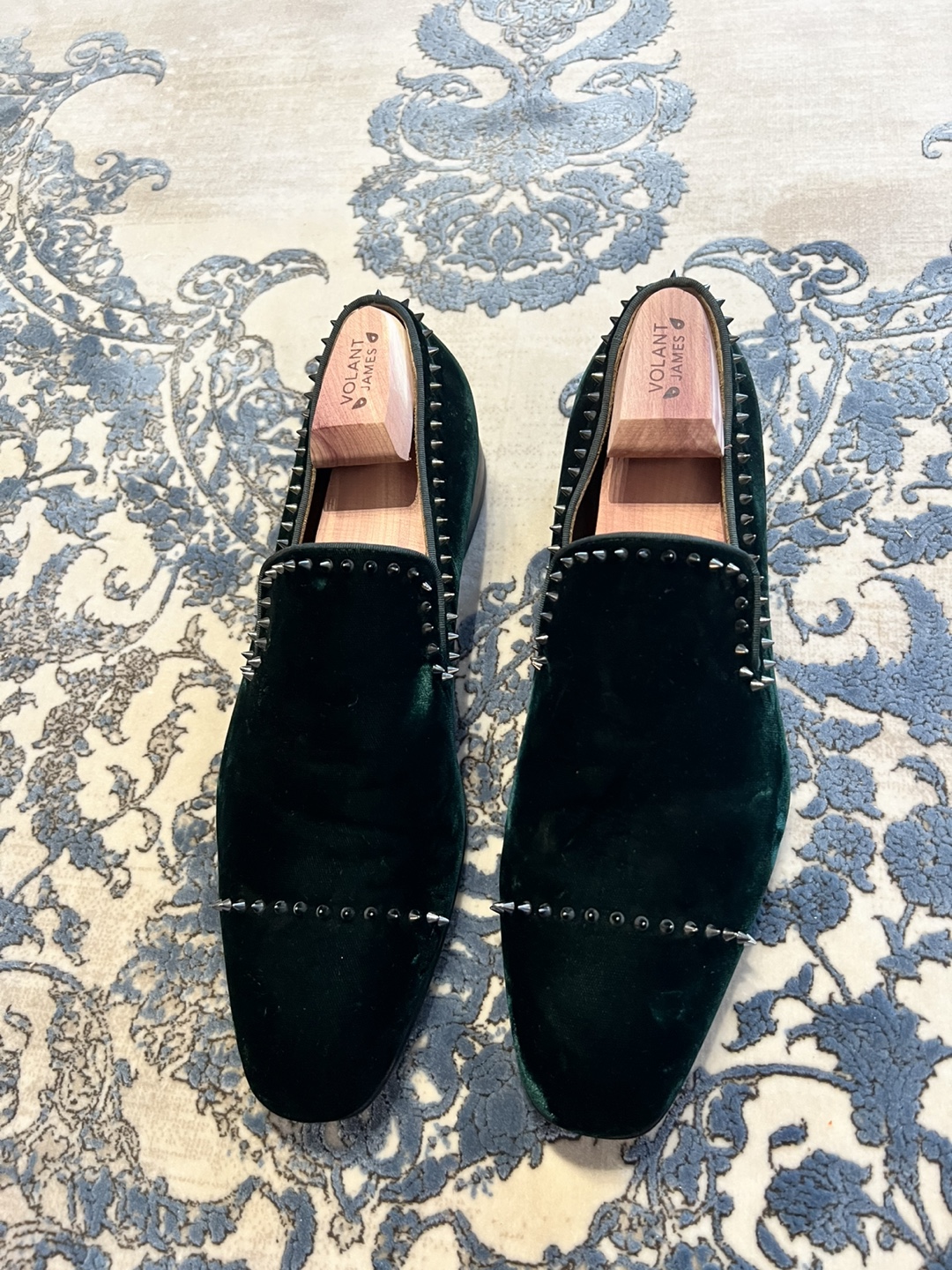 Men's designer loafers. Dark green velvet. Spiked detailing. Red soles. Size 42. Includes shoe trees. Worn just couple of times indoors. Looks brand new. Originally over $1500.