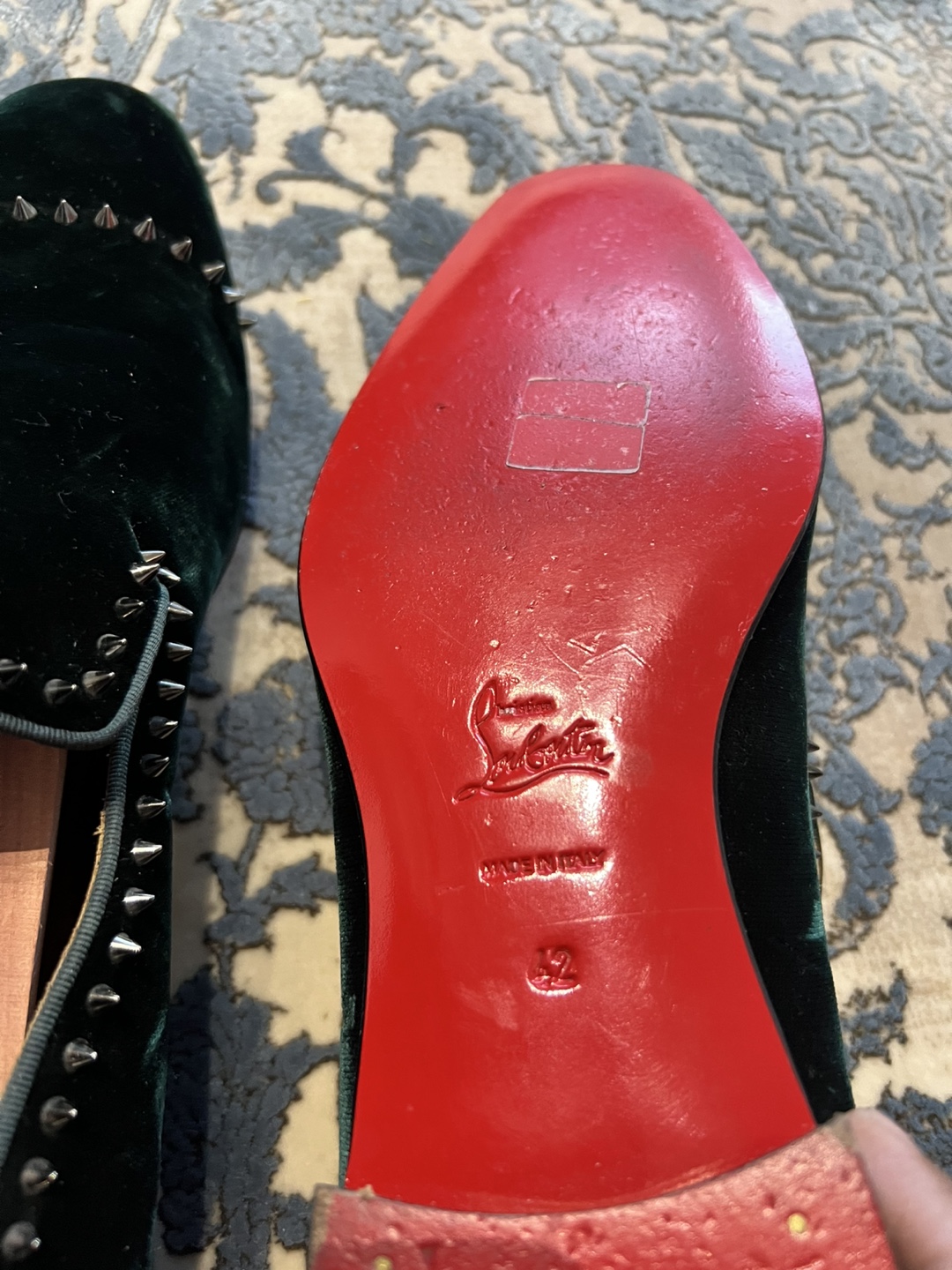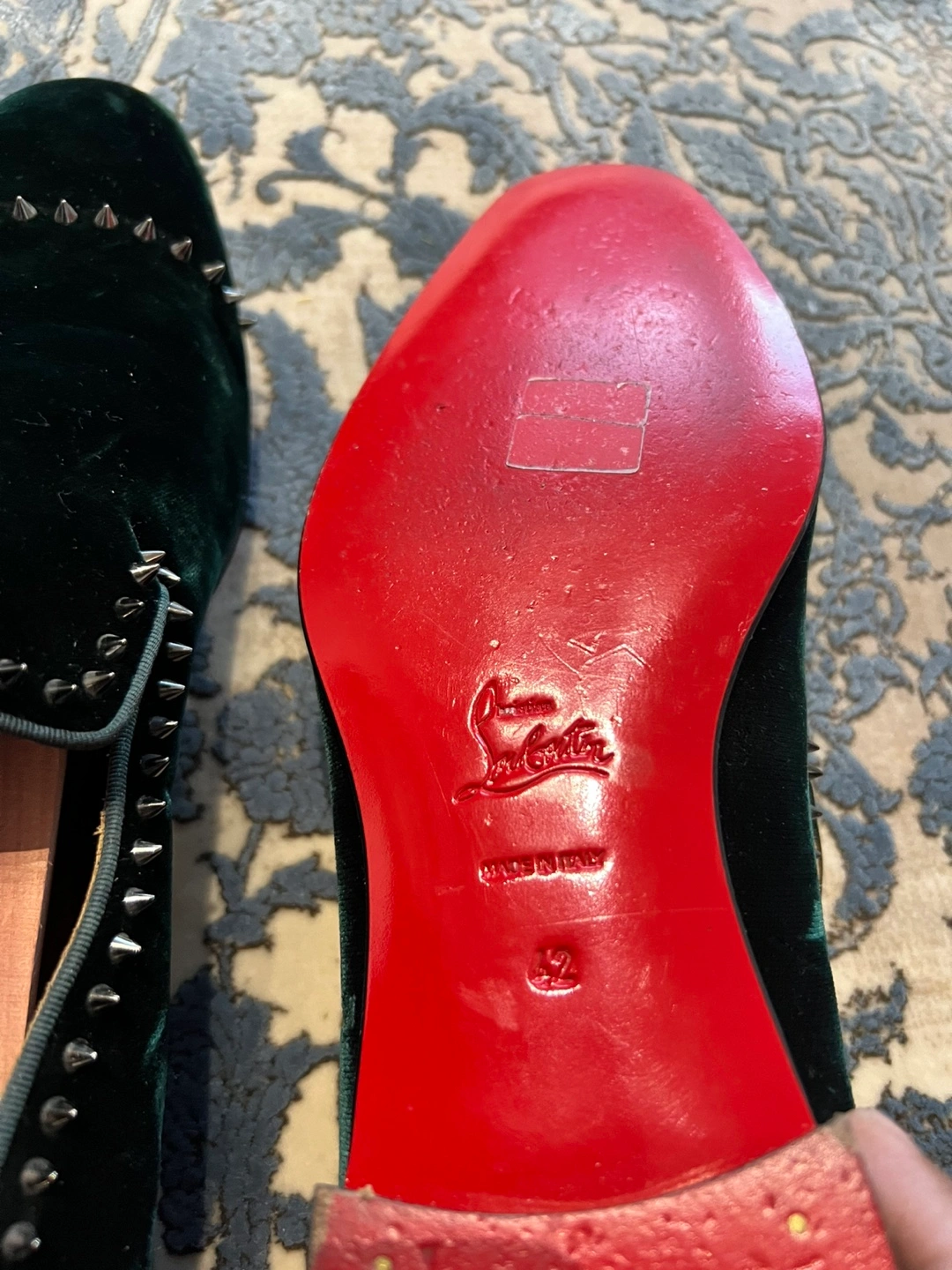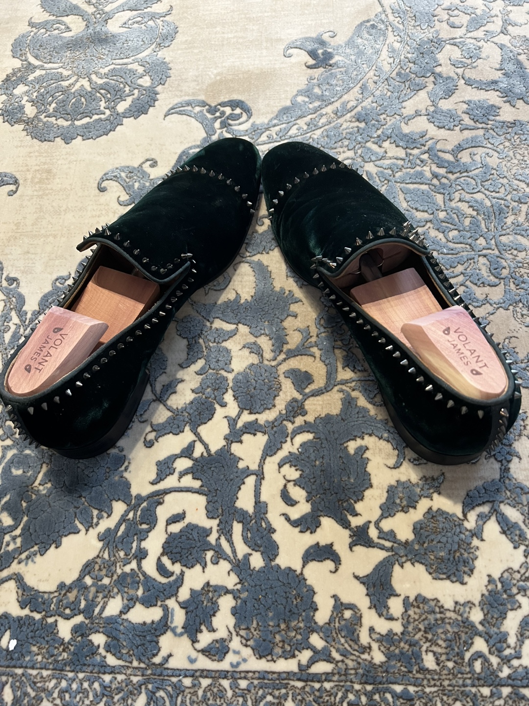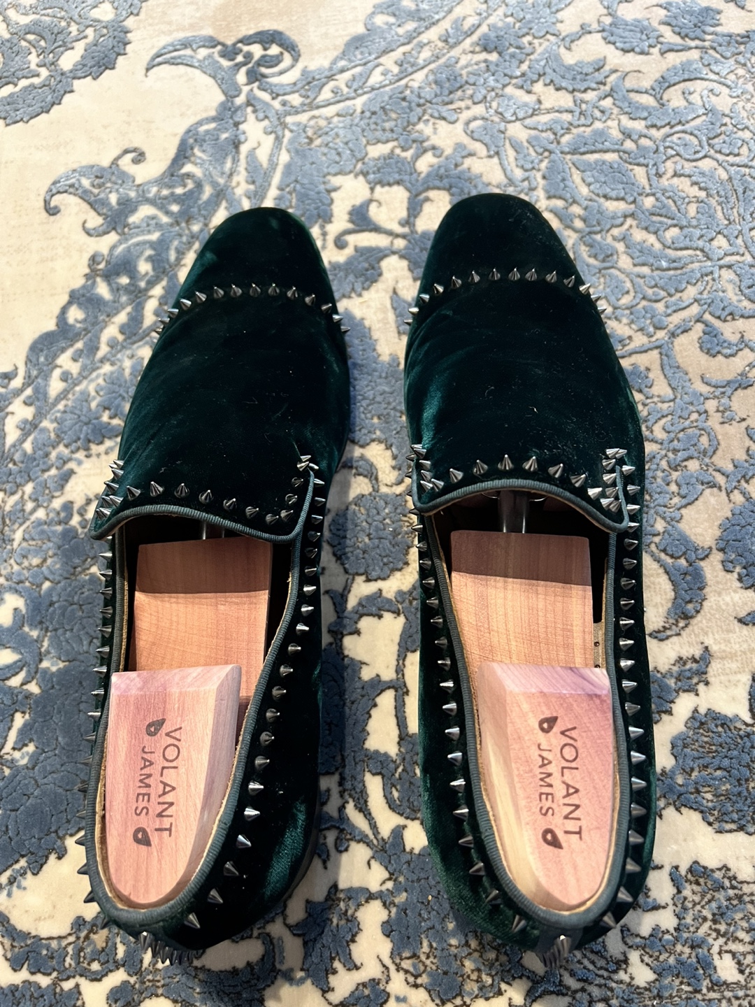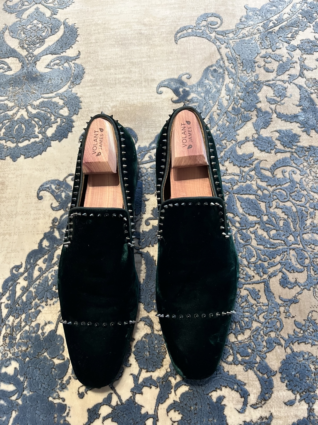 Men's designer loafers. Dark green velvet. Spiked detailing. Red soles. Size 42. Includes shoe trees. Worn just couple of times indoors. Looks brand new. Originally over $1500.