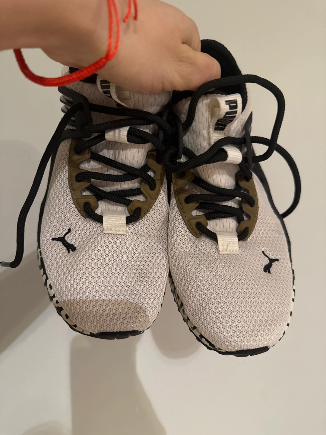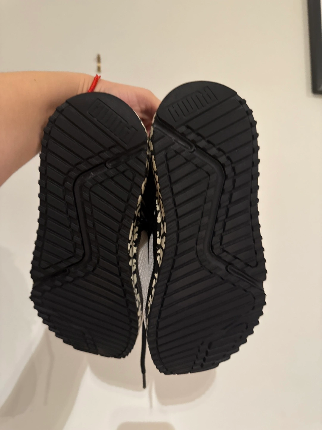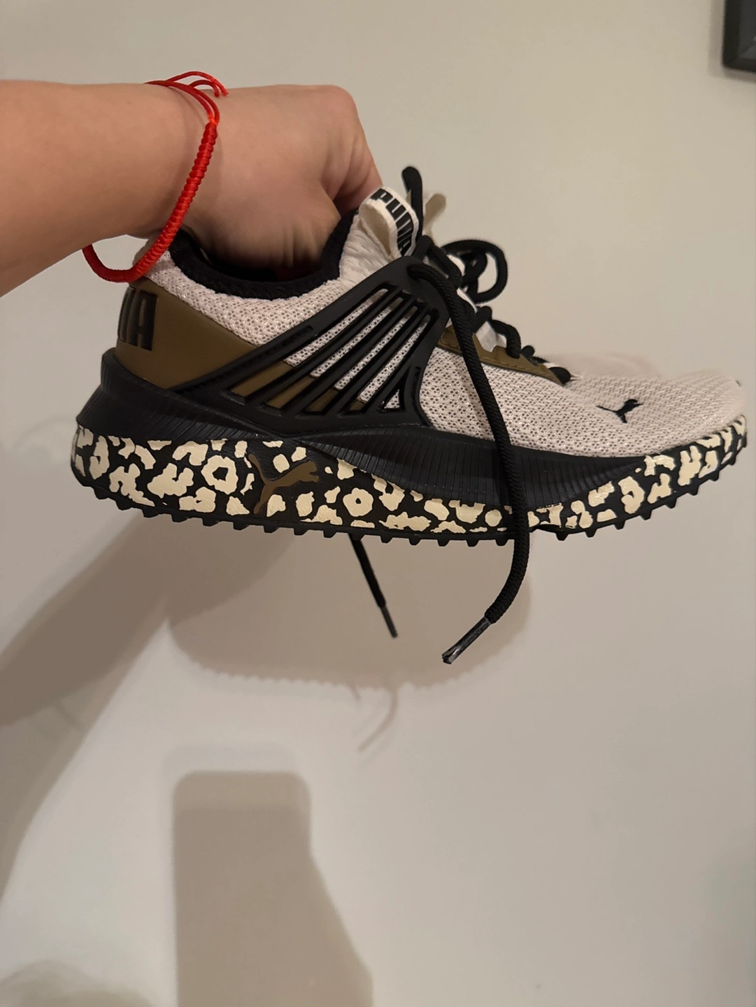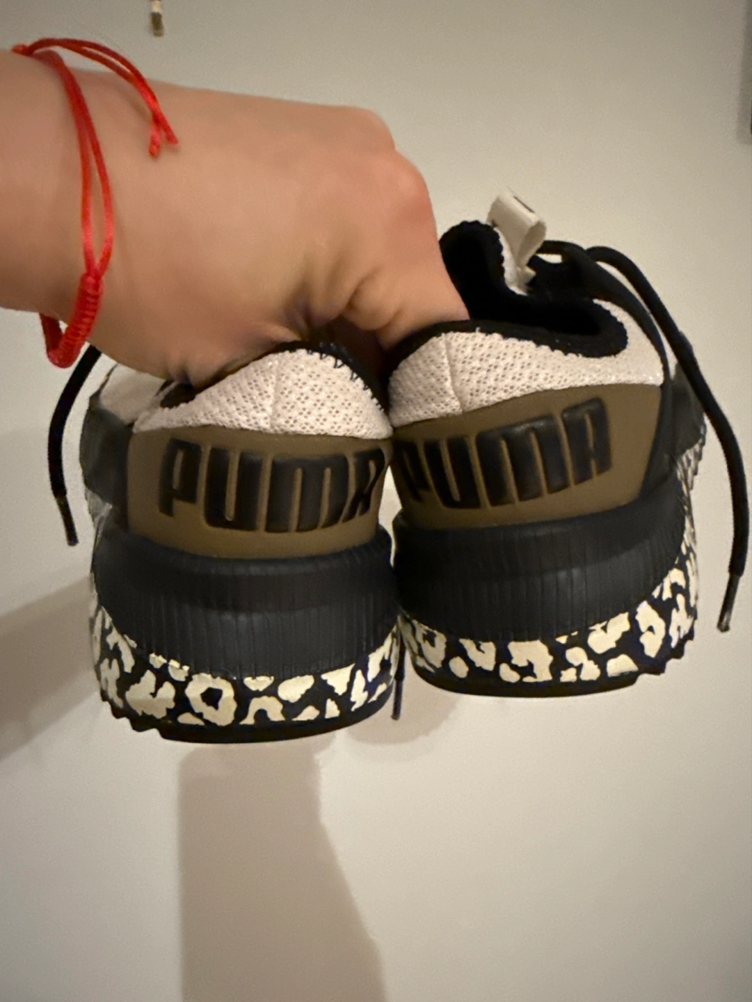 Women's running shoes. White and black colourblock design. Leopard print accents. Good condition.