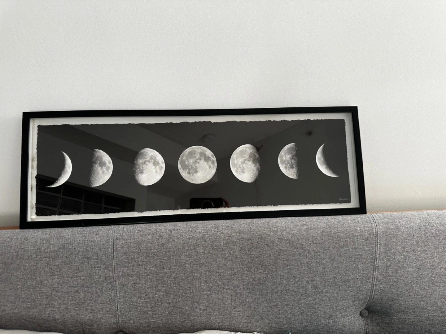 Black and white framed print showcasing the moon's phases. Long rectangular frame. Perfect for minimalist decor.