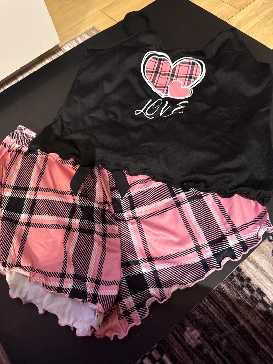 Cute pajama set. Features a black cami top with a pink and black plaid heart design and matching shorts. Shorts have a ruffled hem.