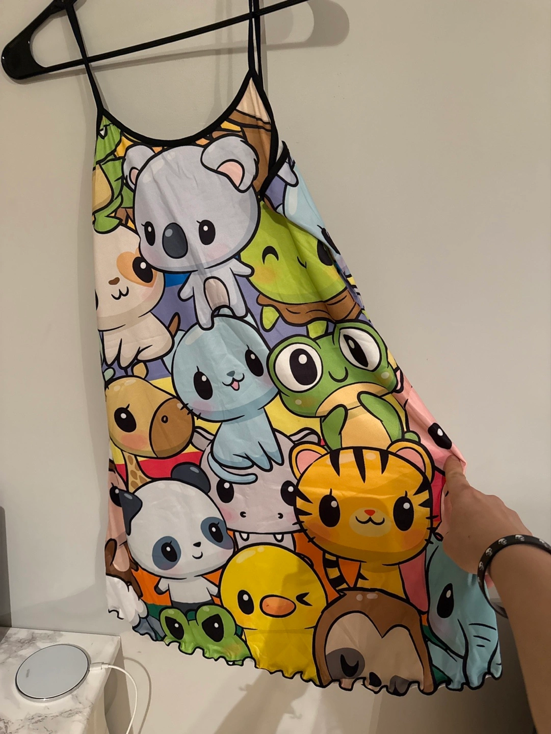 Lightweight summer dress. Features a colourful all-over print of cute cartoon animals. Spaghetti straps and a ruffled hem.
