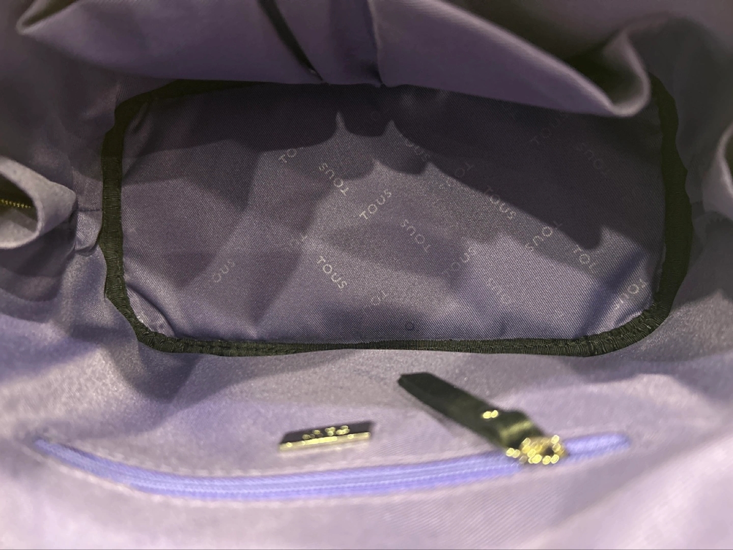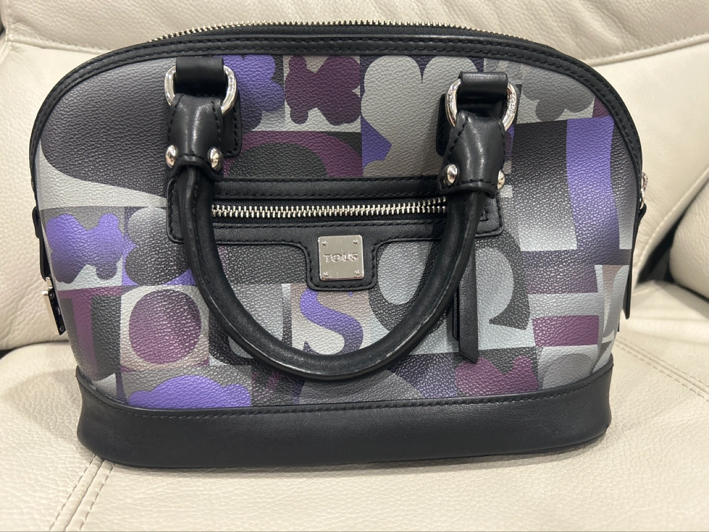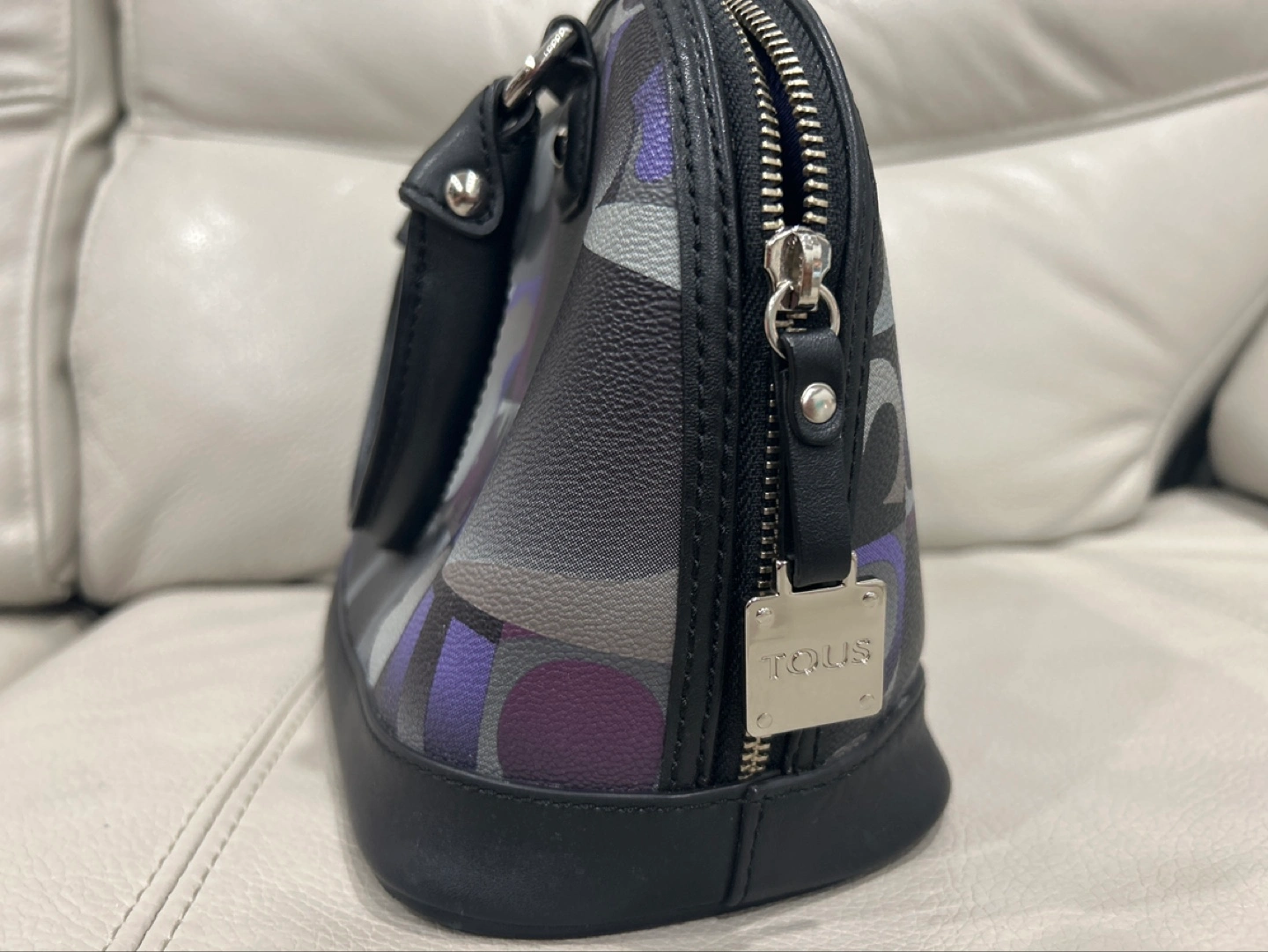Stylish satchel-style handbag. Purple, grey, and black patterned design. Top handles and zip closure. Interior features a purple lining. Small and compact.