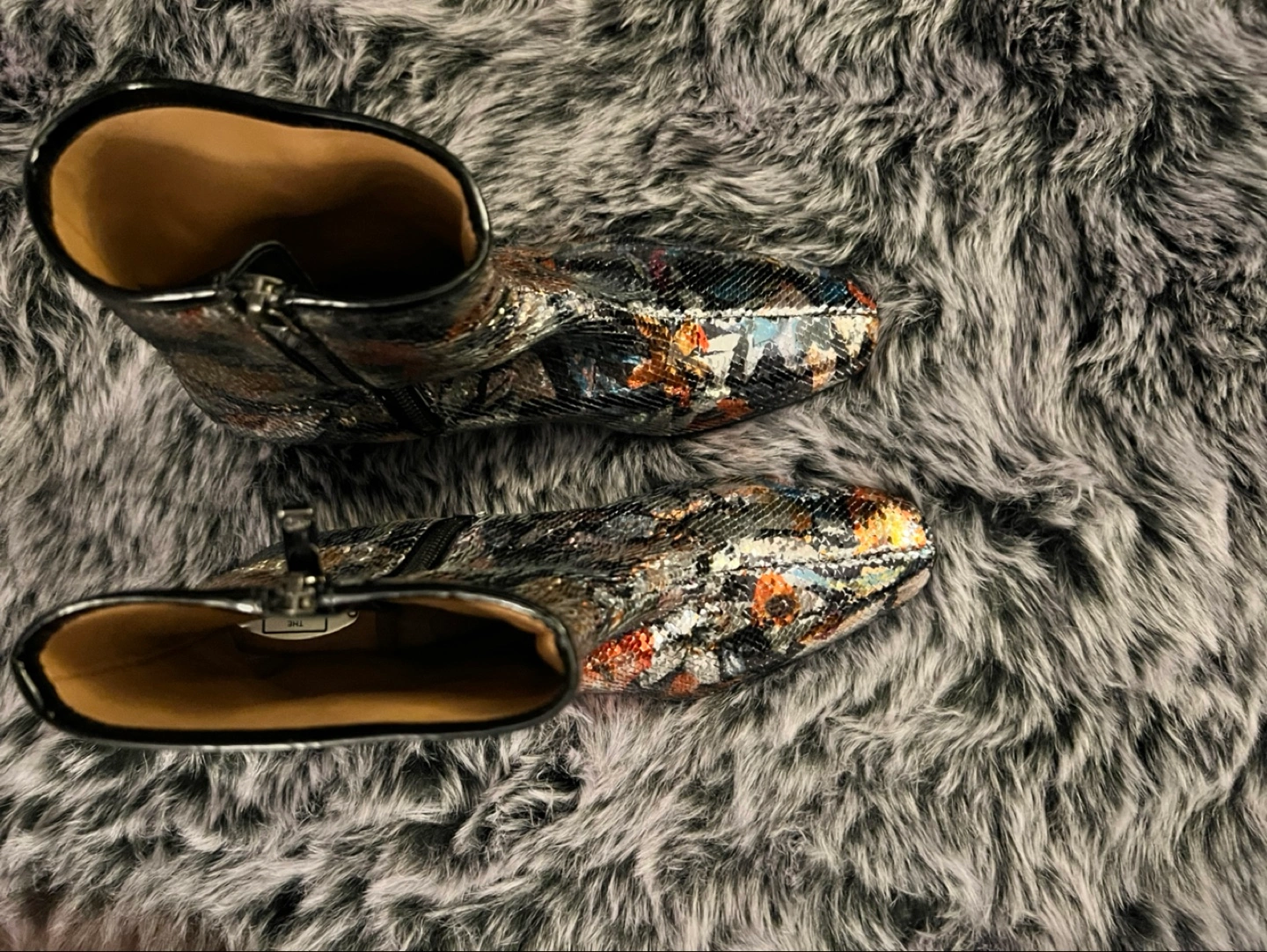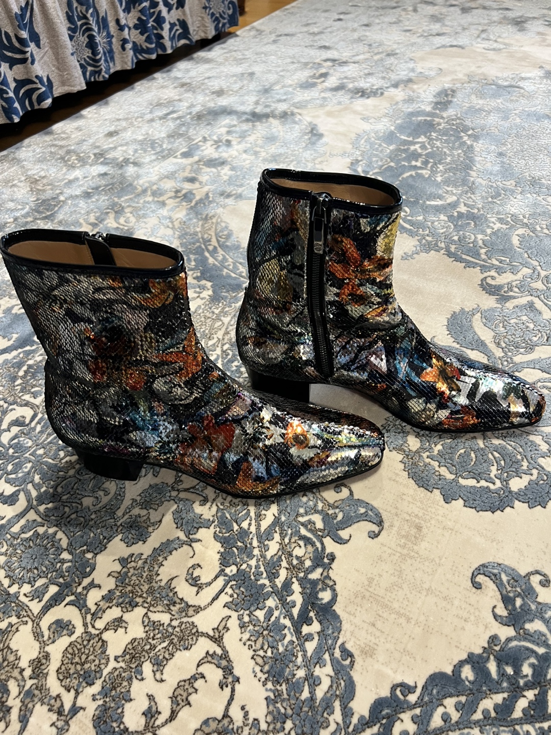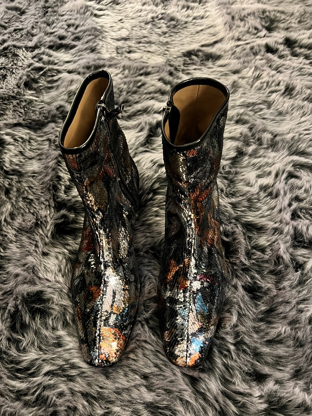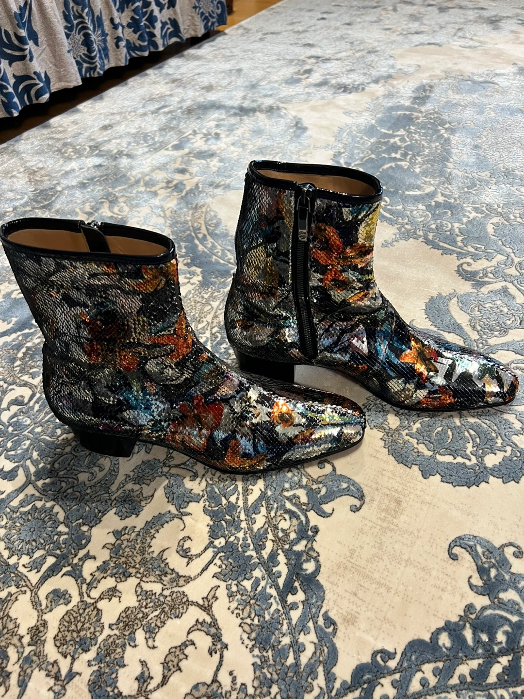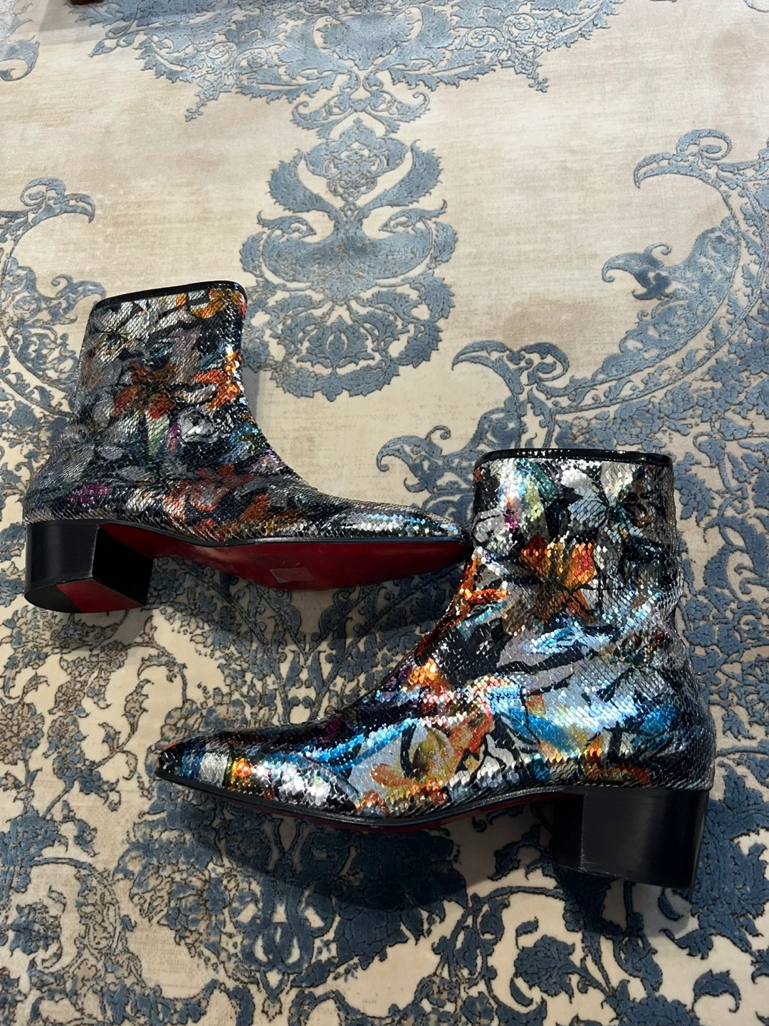 Authentic Christian Louboutin Beautiful ankle boots. Multicoloured sequin pattern. Block heel. Side zipper closure. Excellent condition. Originally over $1500 retail.