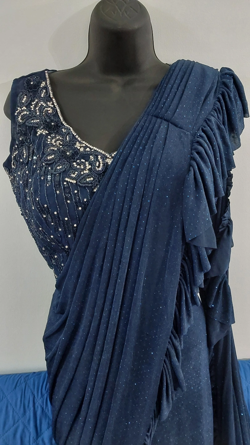 1000+Stunning navy blue pre-draped saree. Features beautiful embellishments on the bodice. Pleated design with ruffles. Ready to wear. Smoke free and pet free home Kindly note all sales are final and no return or refund Please check my other listings aswell😊