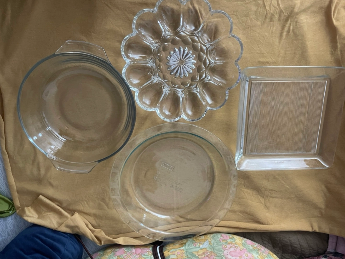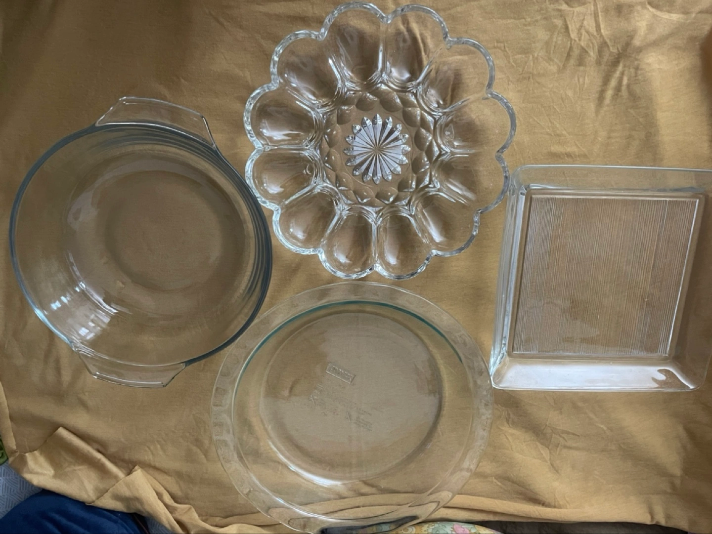 Set of assorted glassware. Includes a Pyrex pie plate, a square glass dish, a round glass casserole dish with handles, and an egg-shaped serving dish. Great for baking and serving. All together prices $40 selling it together.
