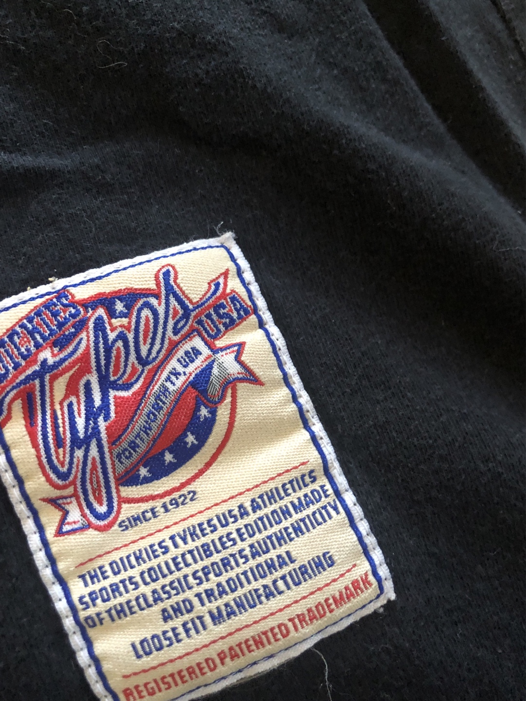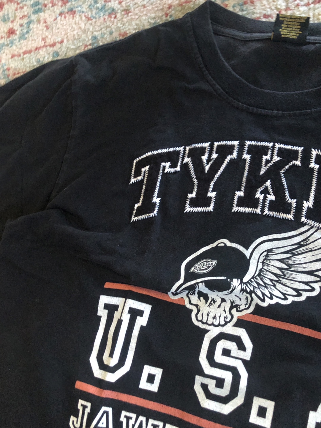 Black short sleeve t-shirt. Features embroidered Tykes logo with skull and wings graphic. Men's size medium. Loose fit. Est. 1922.