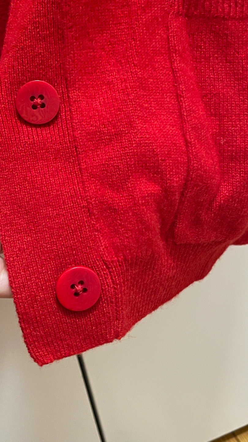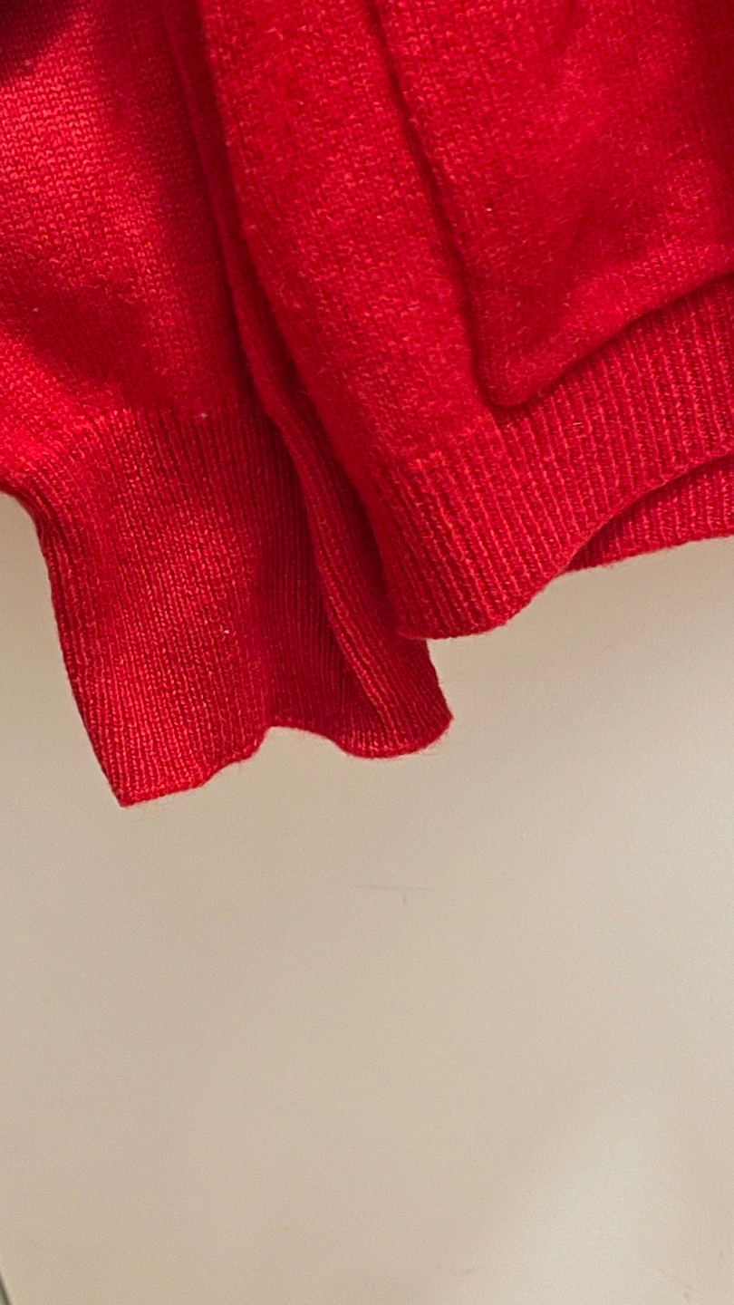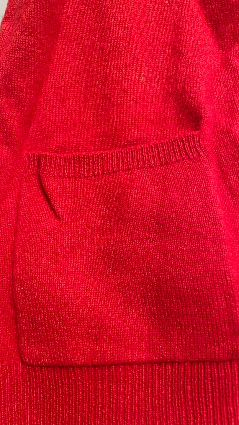 Women's red cashmere blend cardigan. Button closure. Two pockets. Super soft material, perfect for transitional seasons like Spring or Fall.