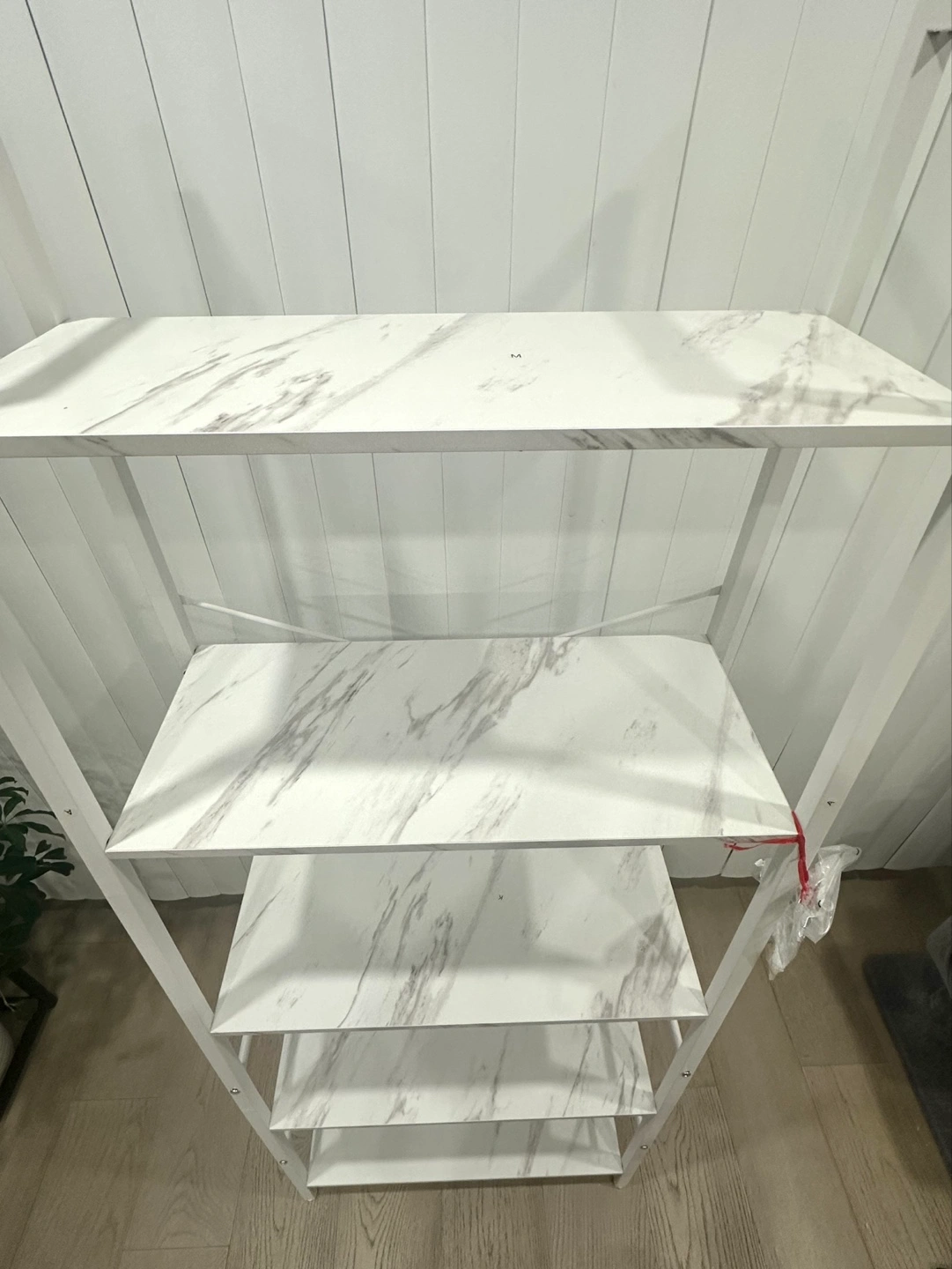 White five-tier shelving unit. Metal frame, scratch-resistant shelves. Versatile design, suitable for various rooms. Sturdy and stable construction. Perfect for storage and organization.