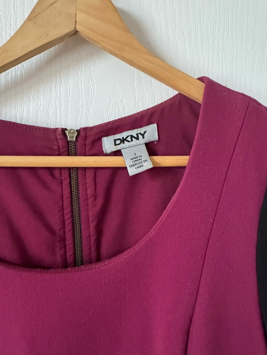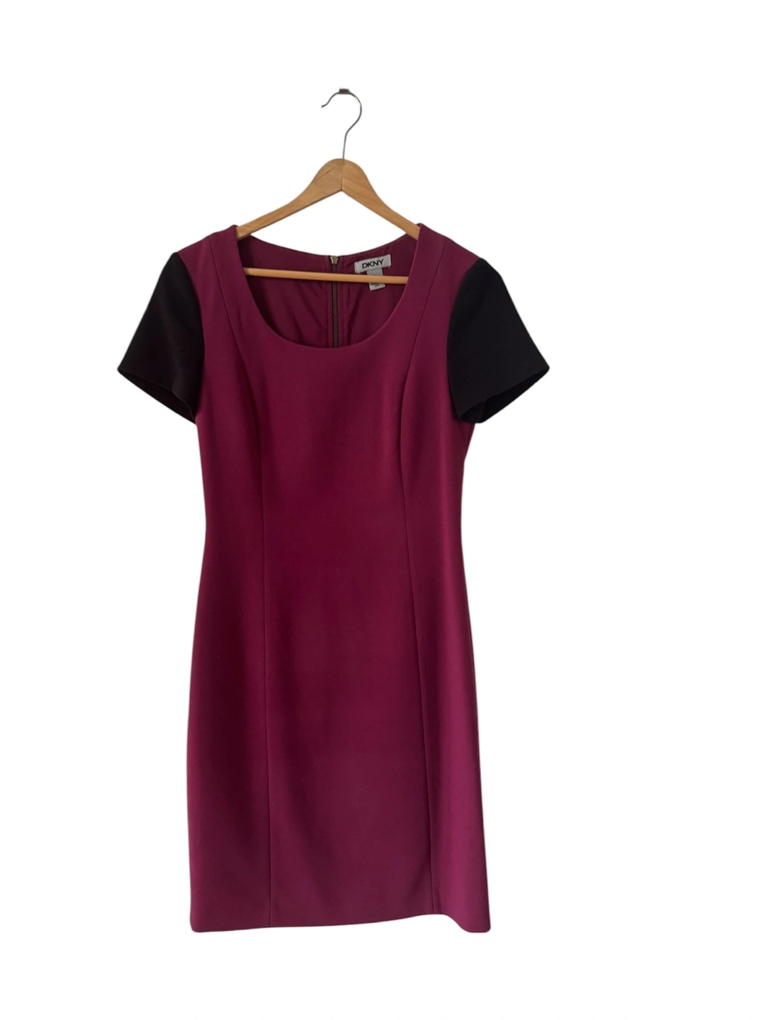 Beautiful purple sheath dress. Features black short sleeves and a centre back zipper. Simple, flattering silhouette. Great for work or a night out.