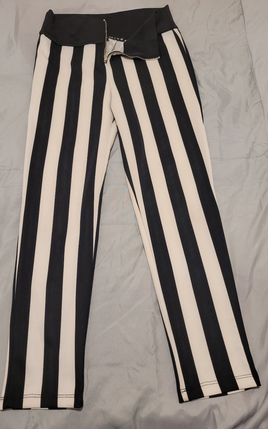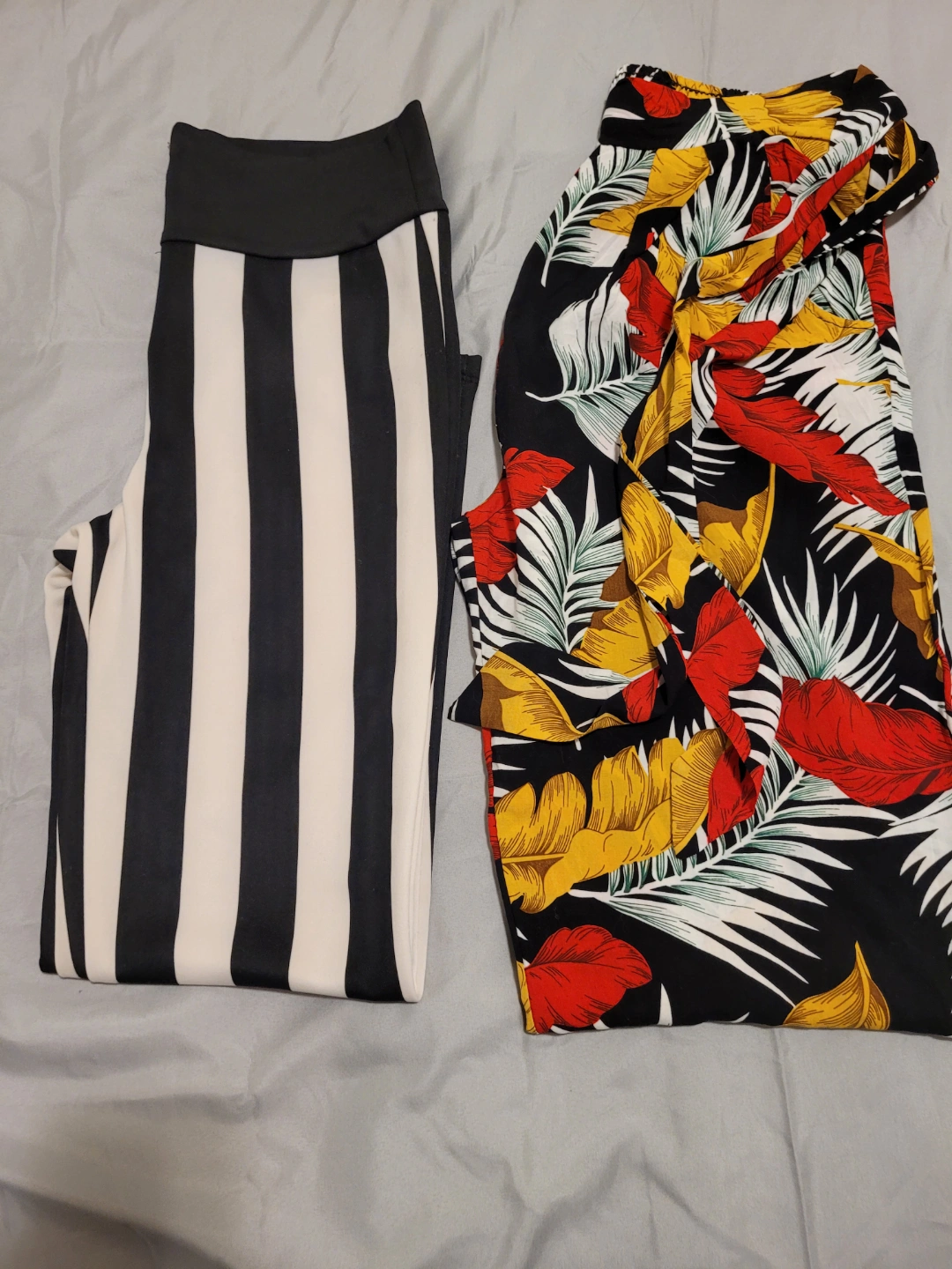 Bundle of two pairs of women's pants.12$ for both One pair features black and white vertical stripes. The other pair has a tropical leaf print in reds, yellows, and greens on a black background. Both appear to be a similar size and length.