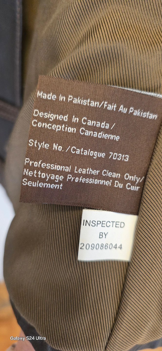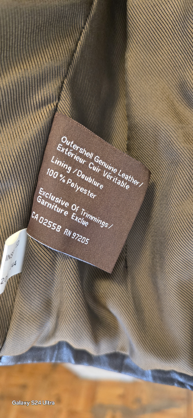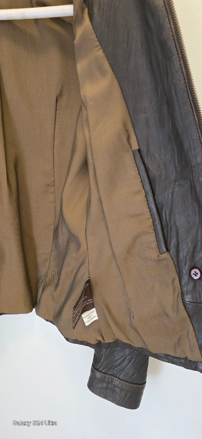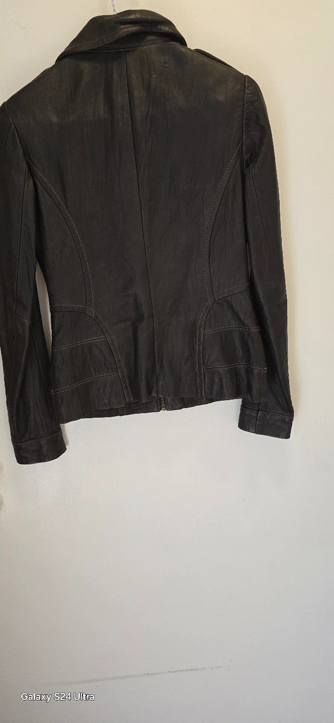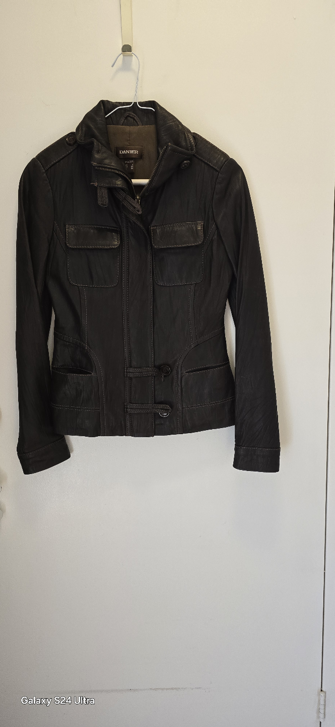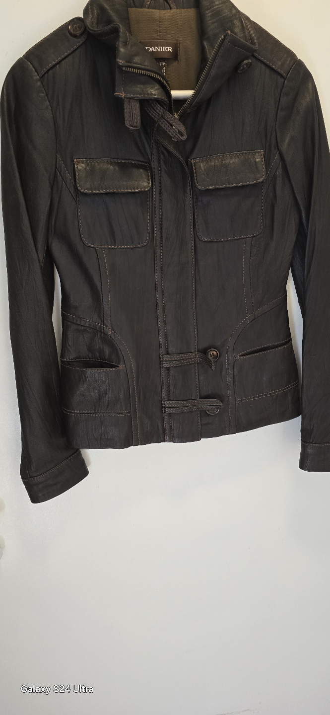 Brown leather jacket. Features multiple pockets, zip closure, and toggle buttons. Size small. Good condition.