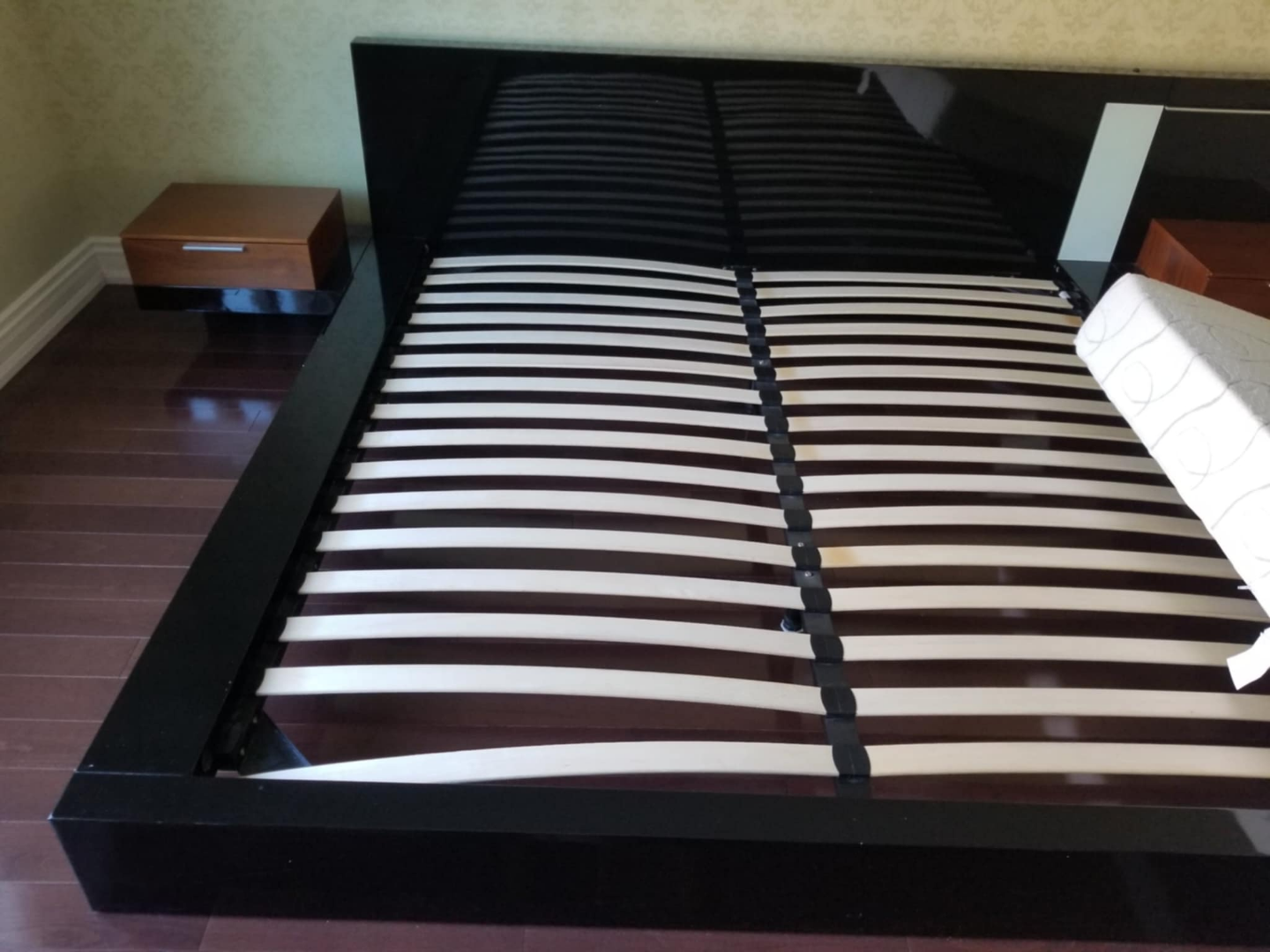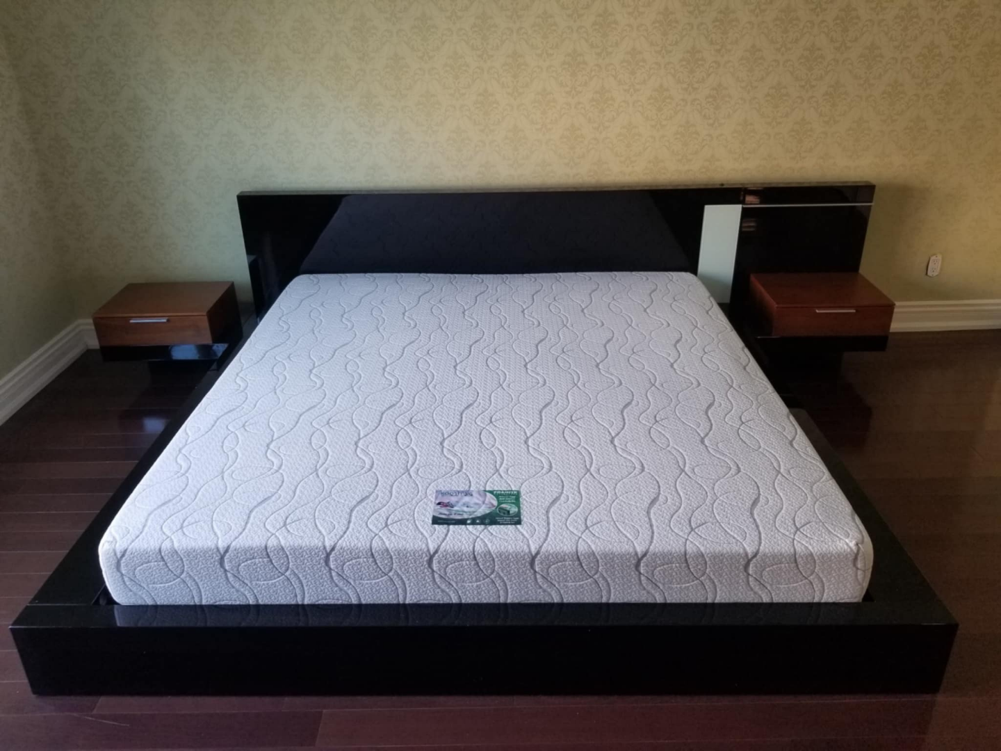 Sleek black platform bed frame. King size. Includes two matching nightstands(floating linked to the bed).