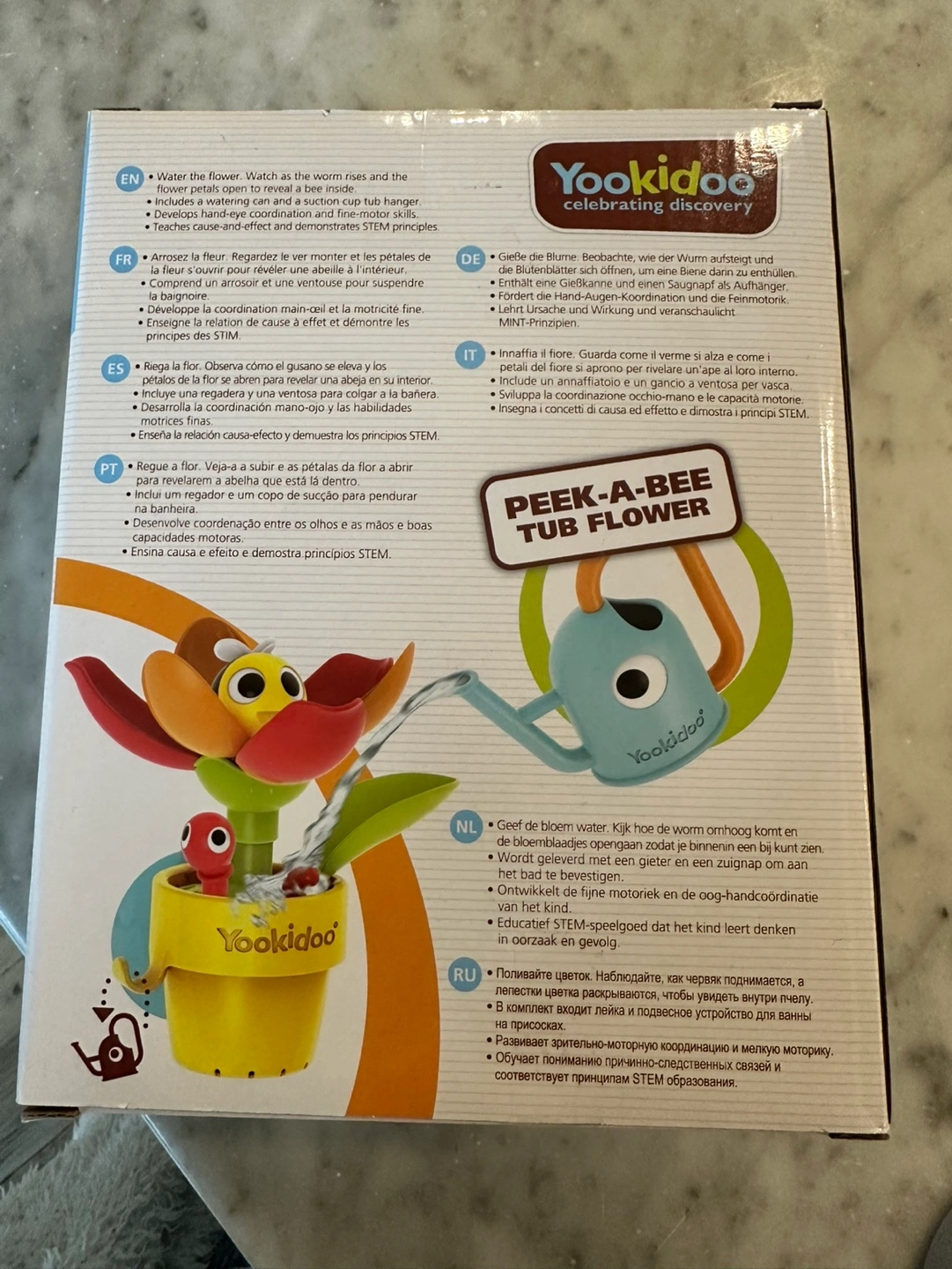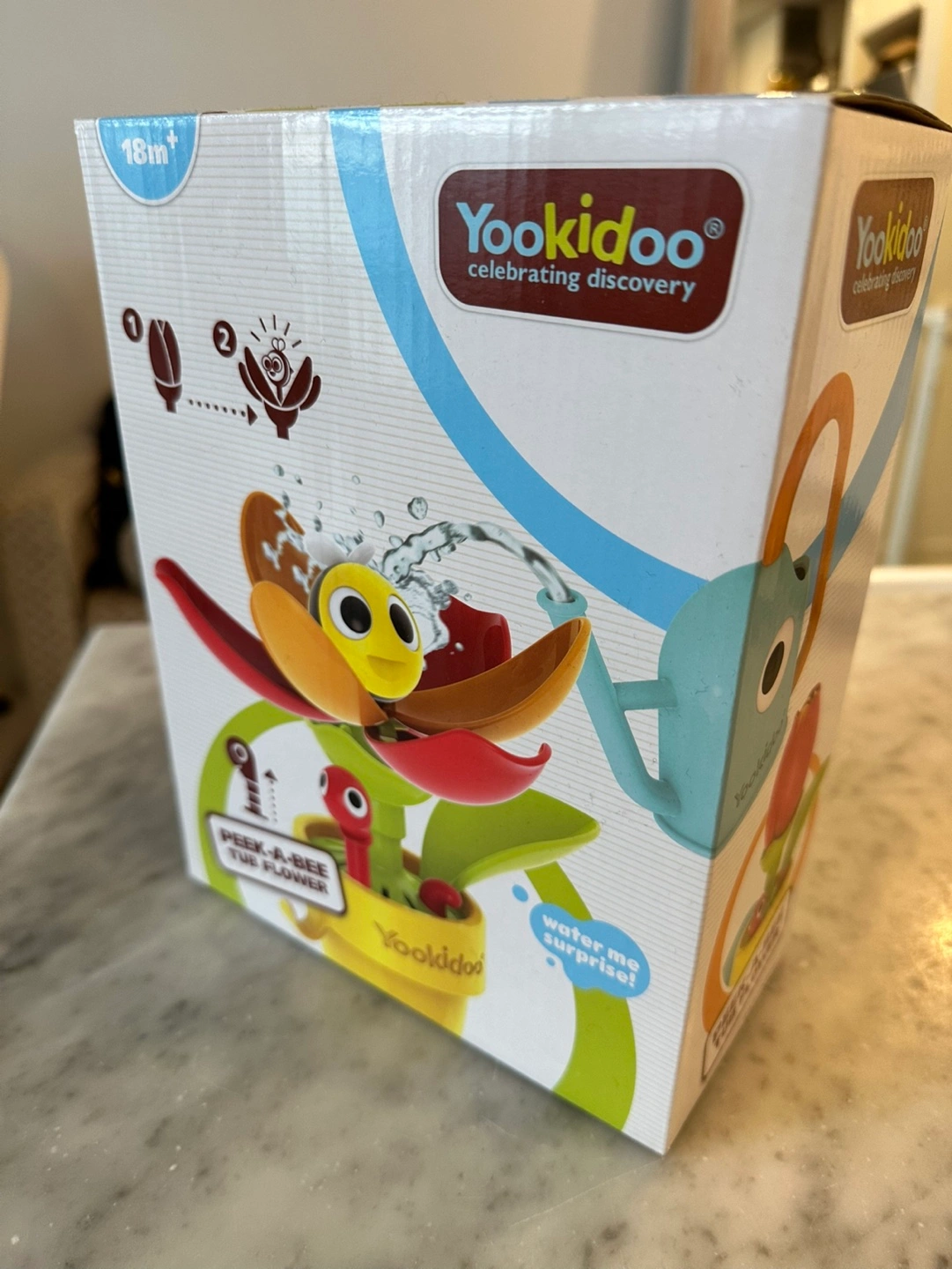 New in box. Bath toy for toddlers. Features a flower that rises as water is poured. Includes a watering can. Develops hand-eye coordination and cause-and-effect.