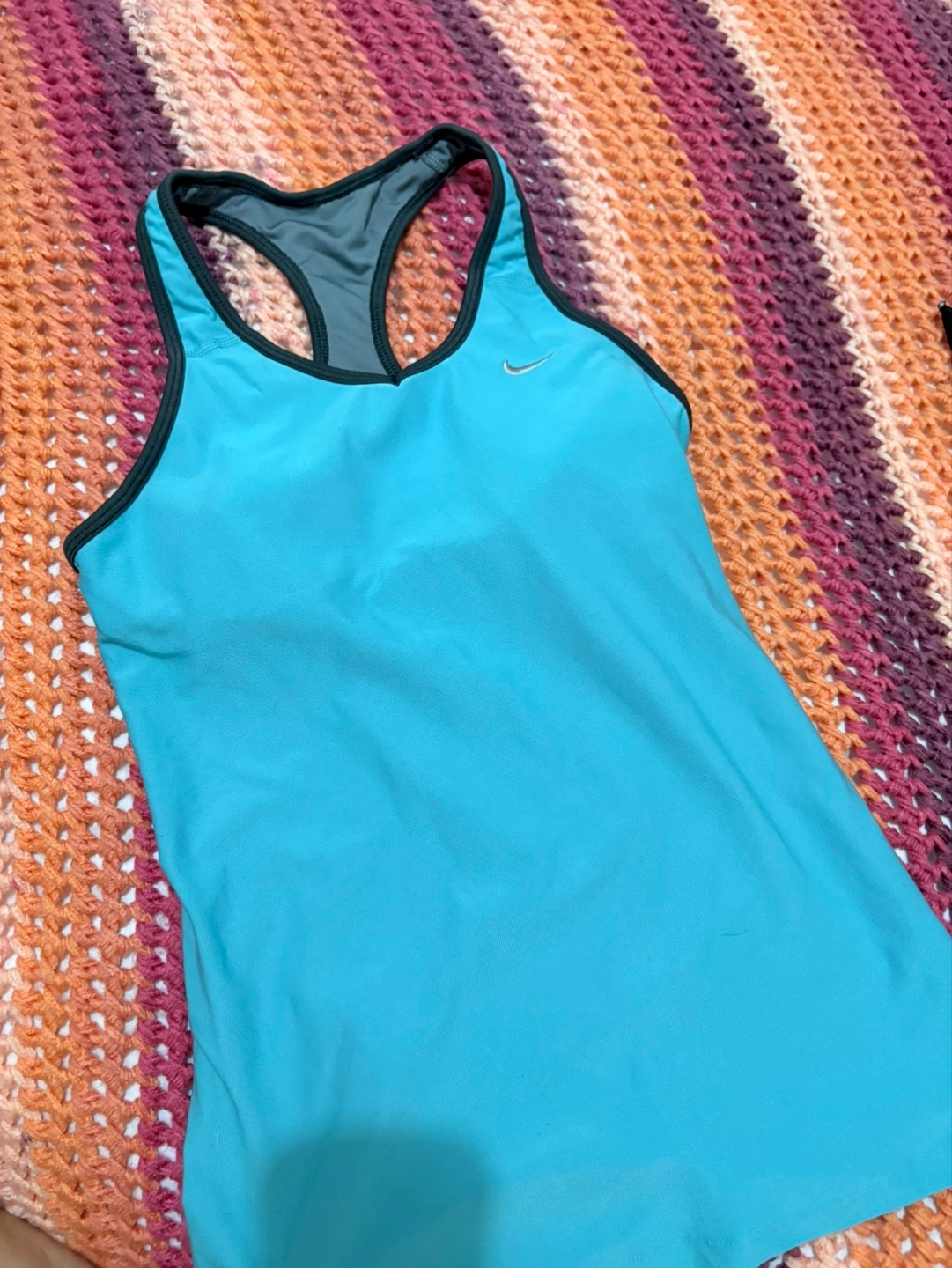Women's athletic tank top. Light blue with grey accents. Racerback style. Nike logo. Good for workouts or casual wear.