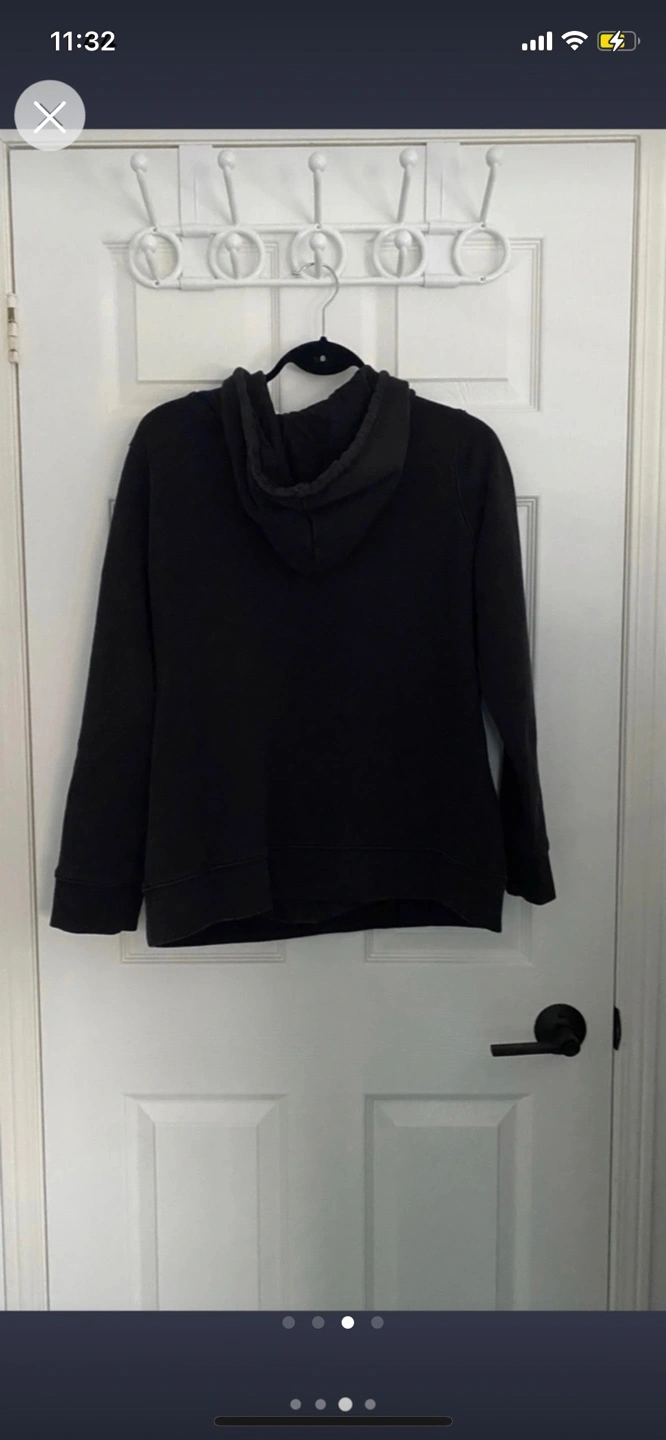 Black Adidas hoodie. Large size. Features a large white Adidas logo on the front. Long sleeves, drawstring hood.