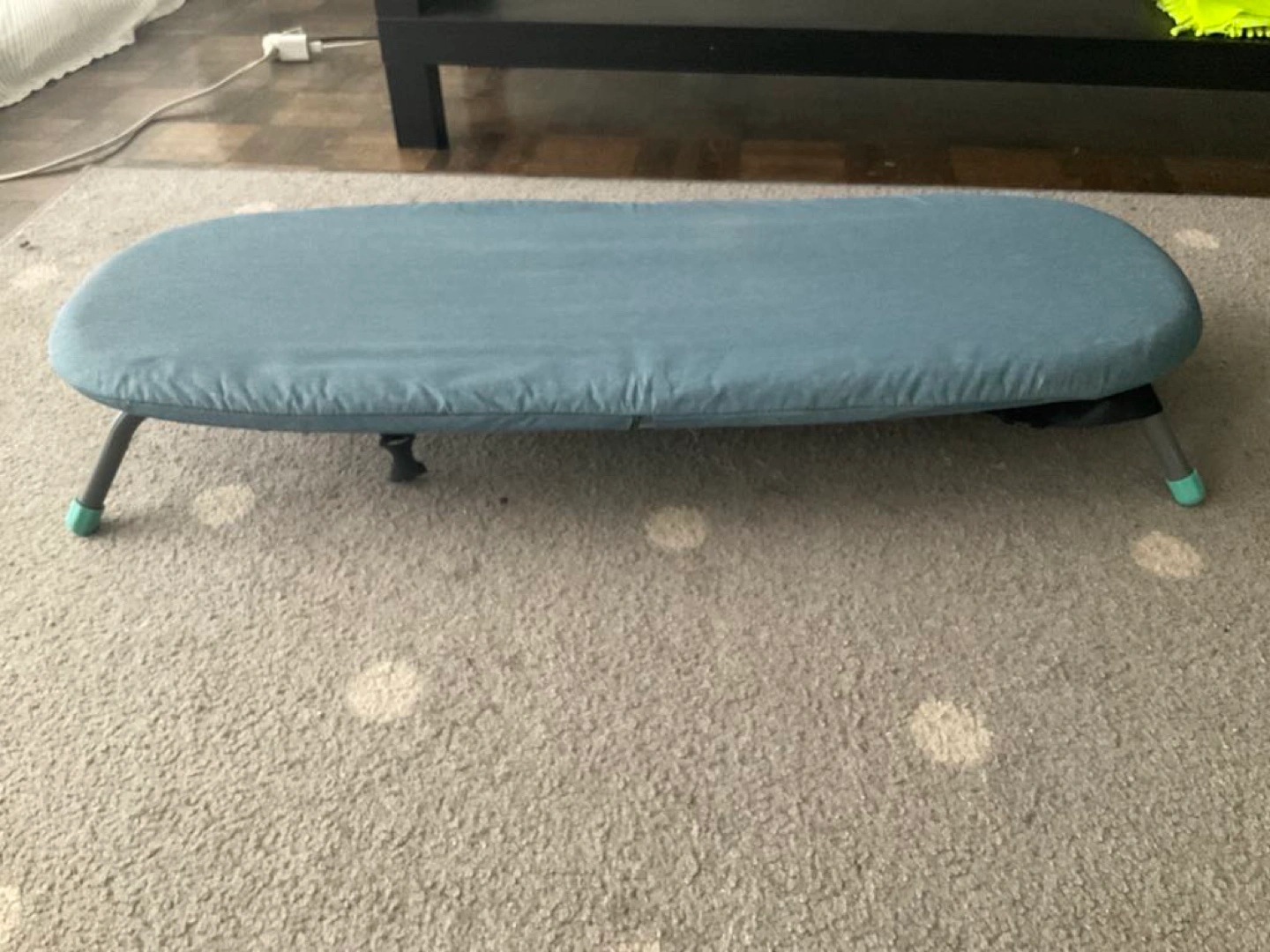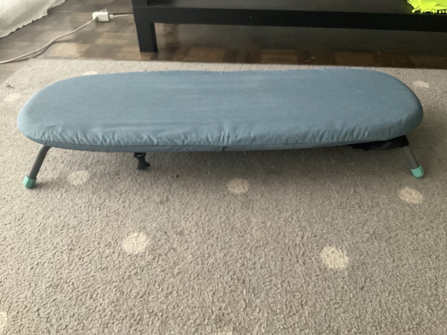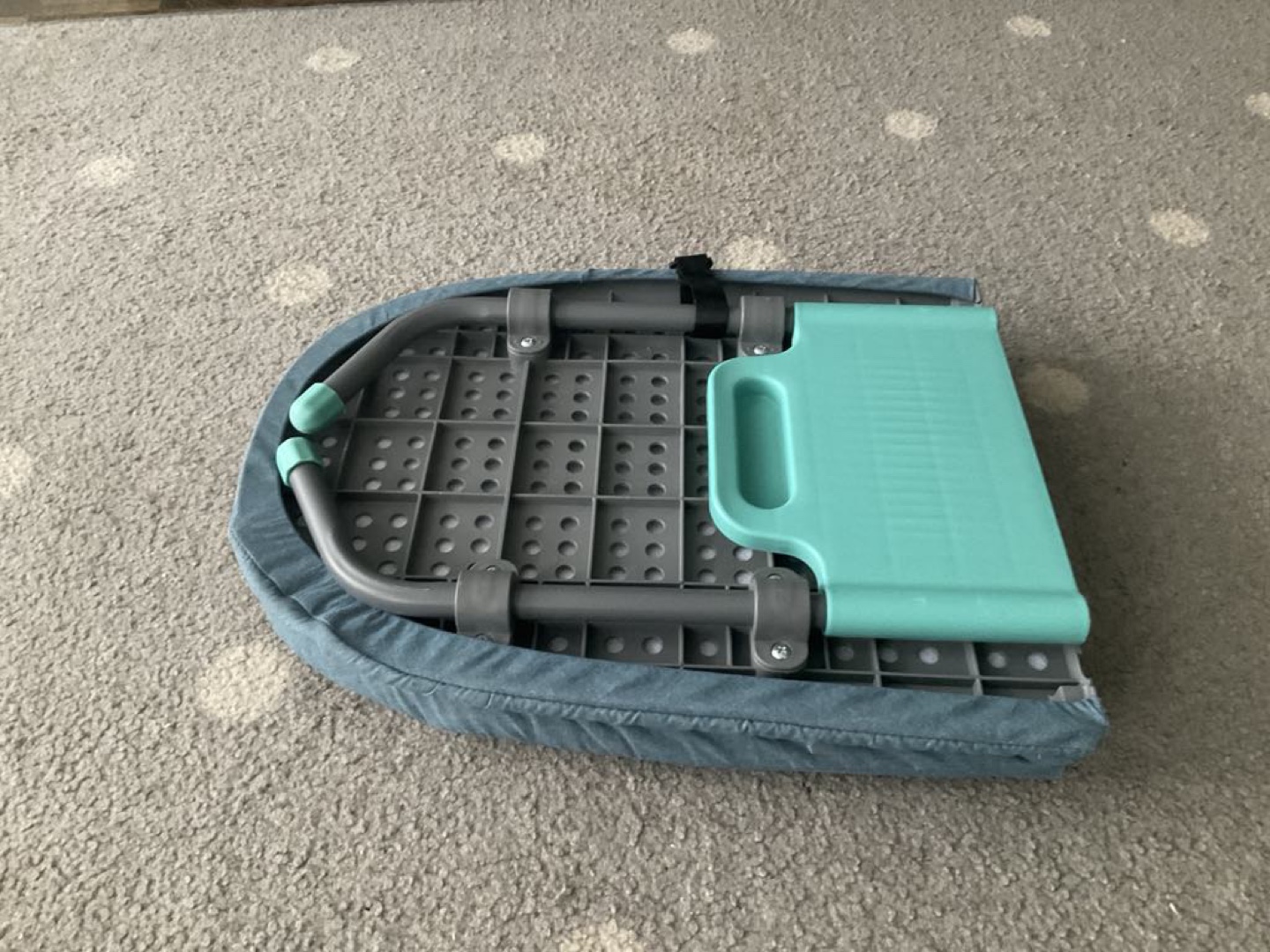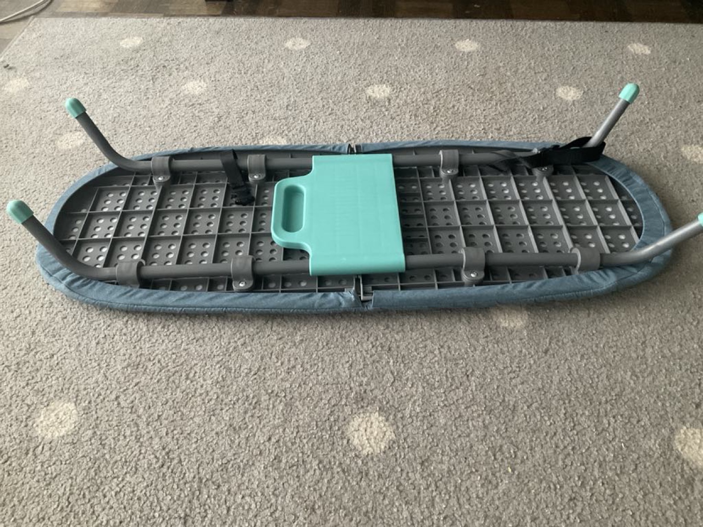 Lightweight and easily foldable ironing pad. Compact design, great for travel. Teal fabric cover. Grey plastic frame.