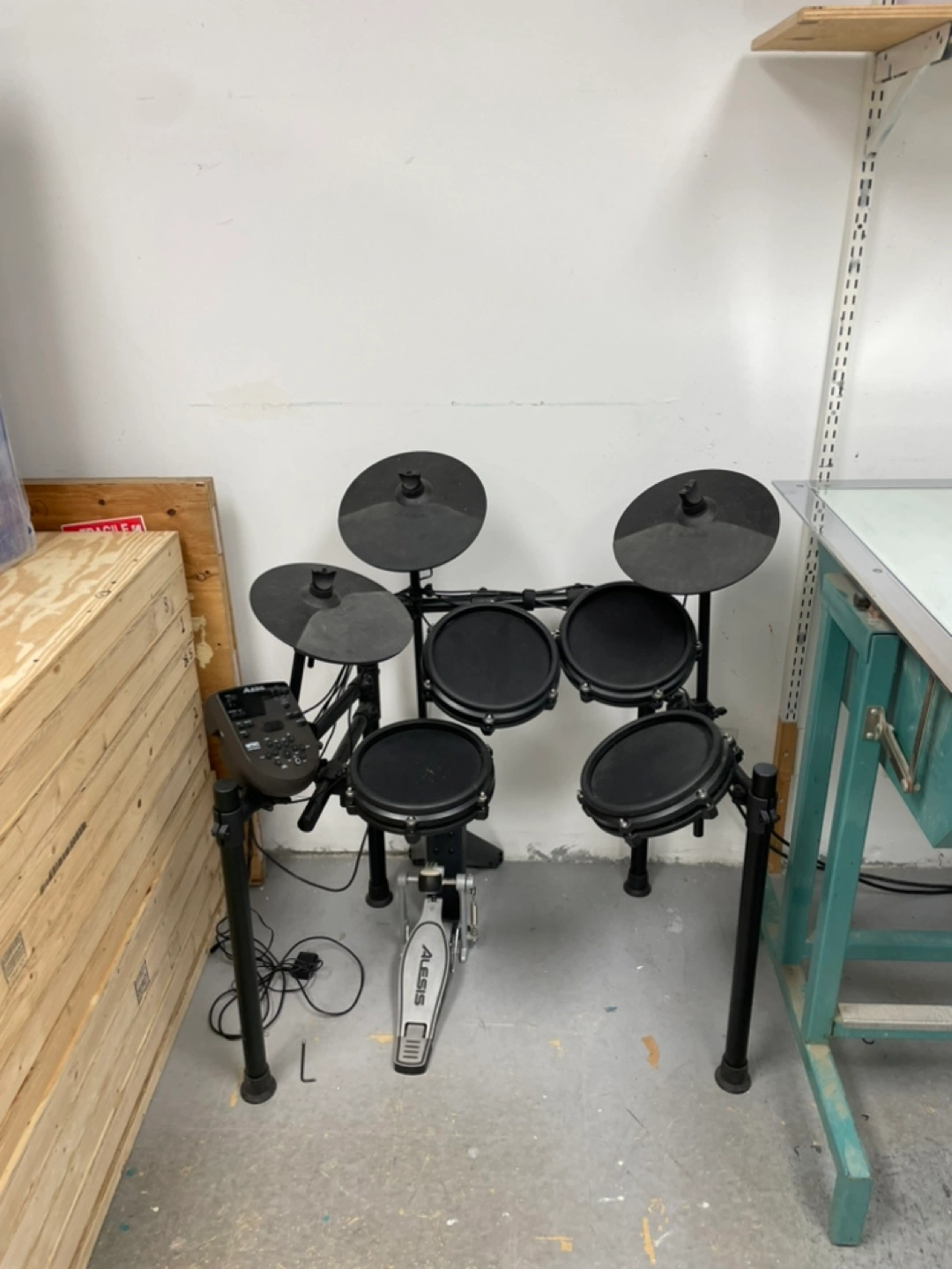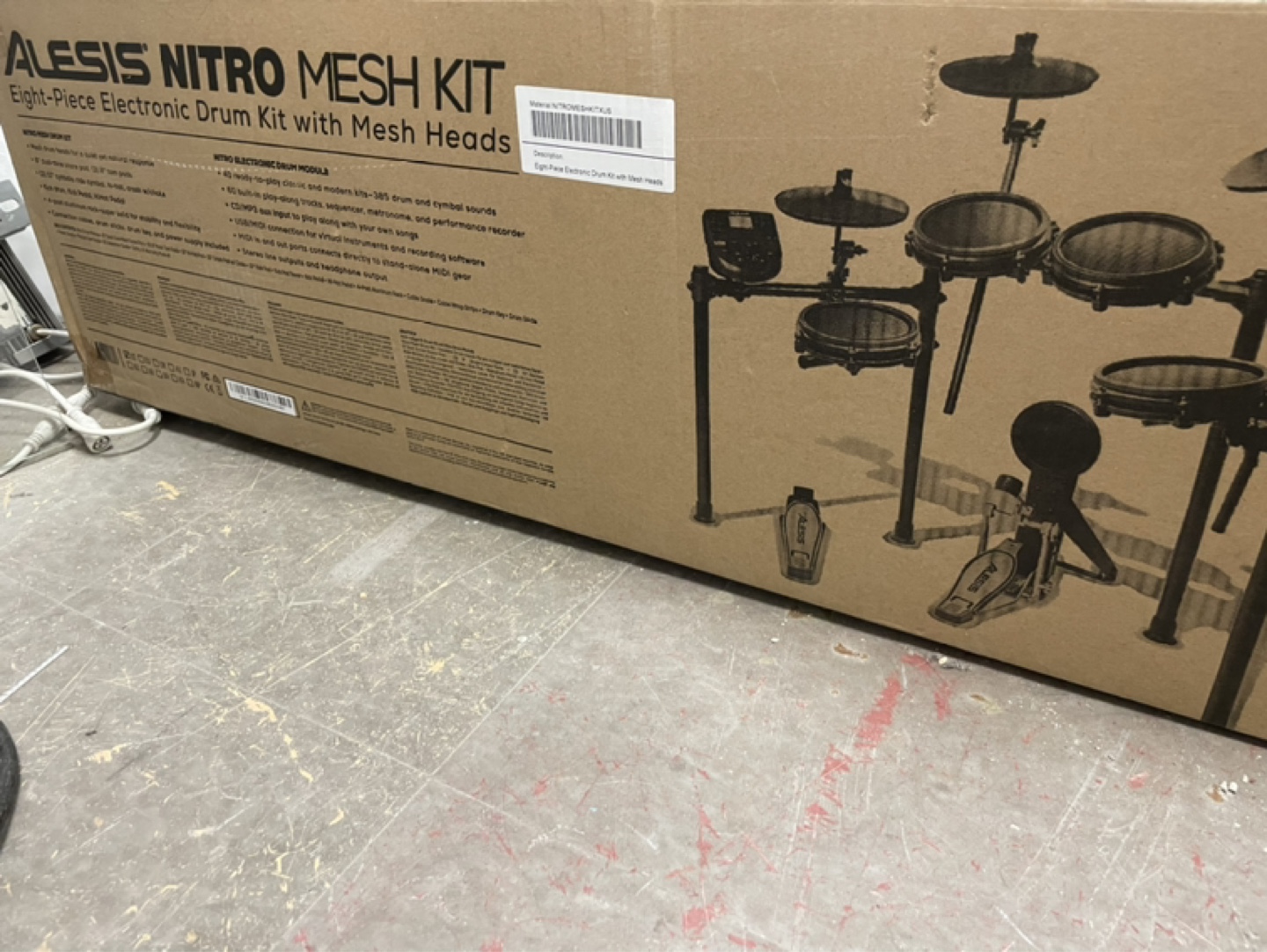 Alesis Nitro Mesh Kit. Eight-piece electronic drum kit with mesh heads. Includes module, cymbals, and hi-hat. Great for practice and performance.