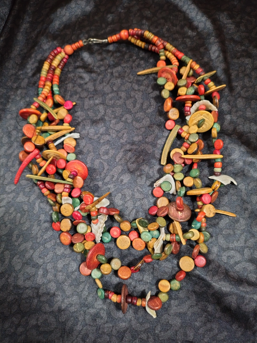 Layered necklace featuring vibrant, multicoloured wooden beads. Includes unique shell and bone-like accents. Bohemian style. Beautiful statement piece.
