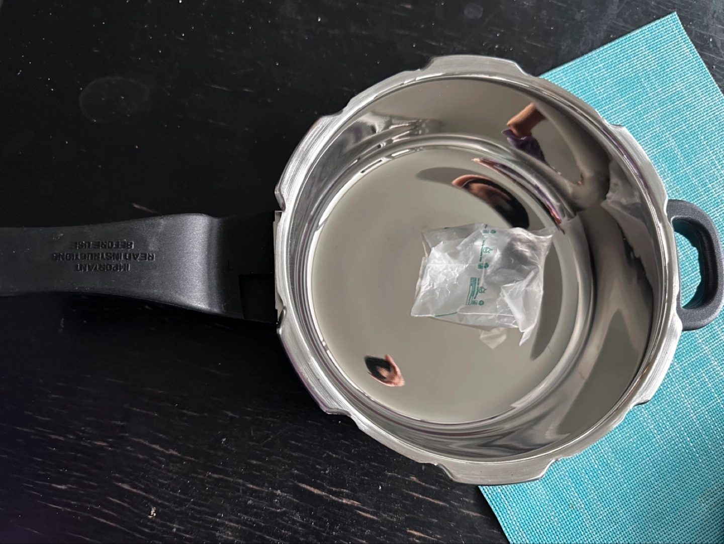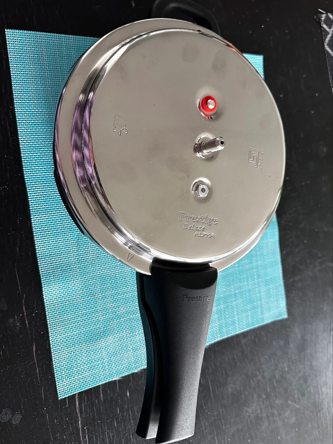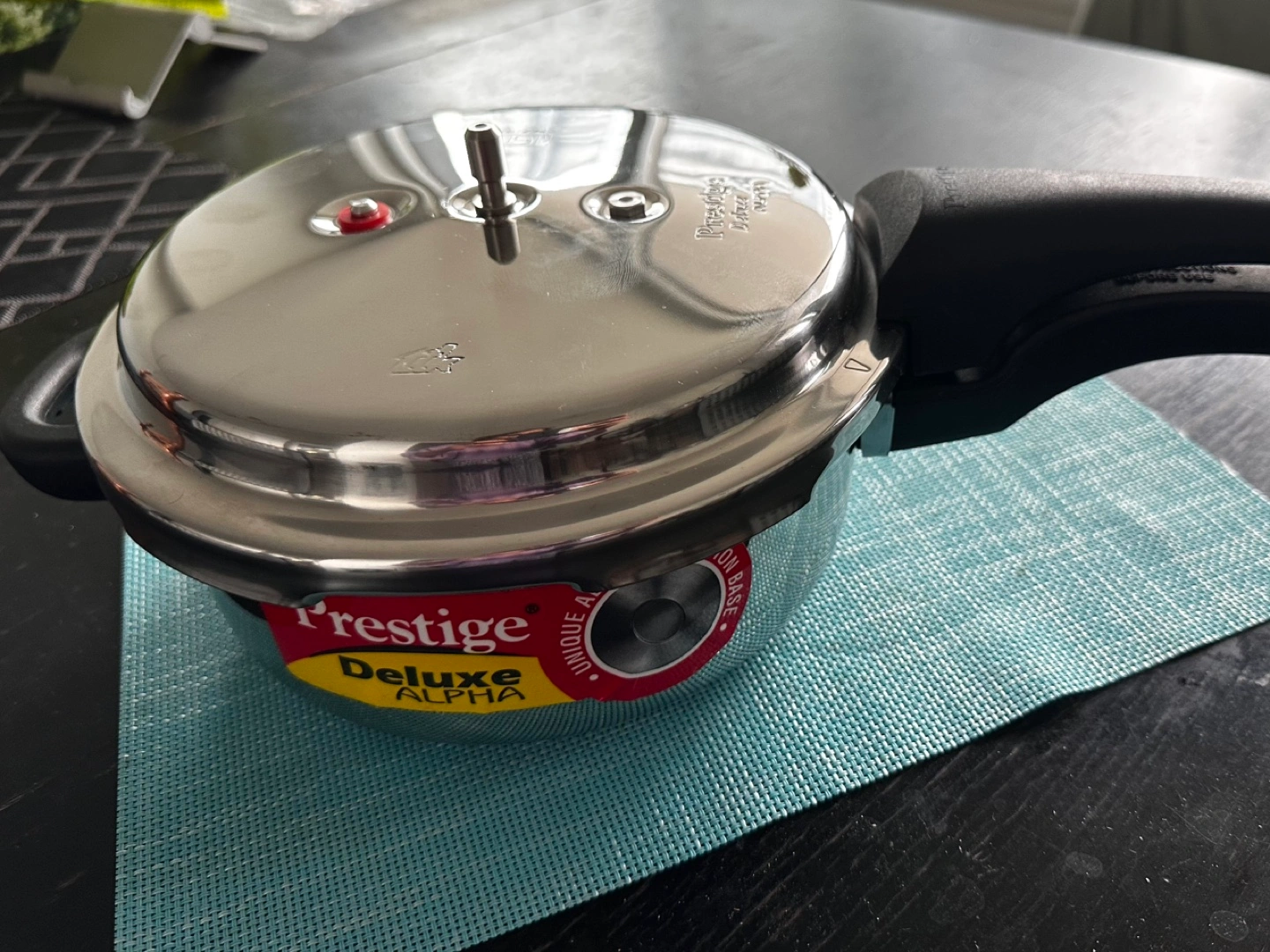 Brand new Stainless steel pressure cooker. Black handle. Includes a small packet of whistle.