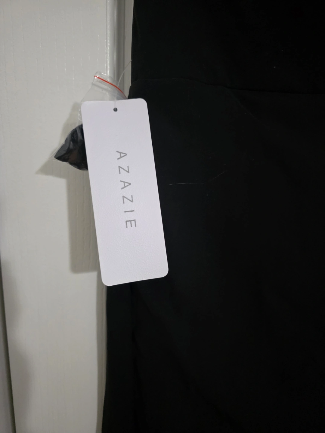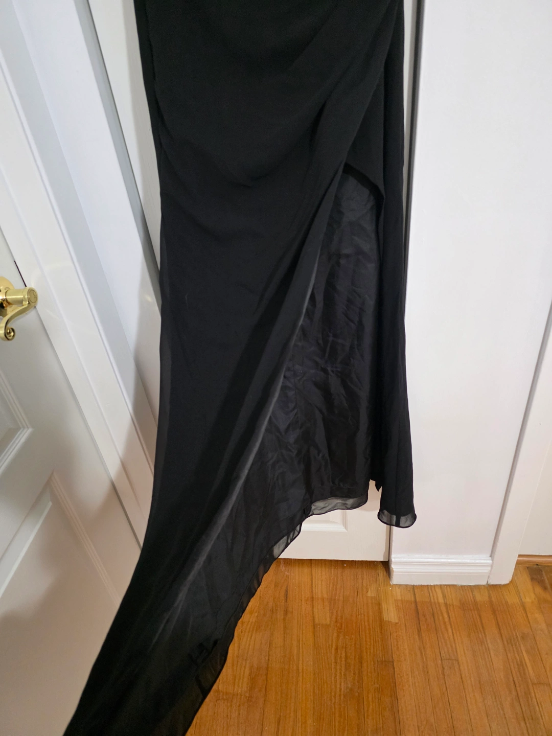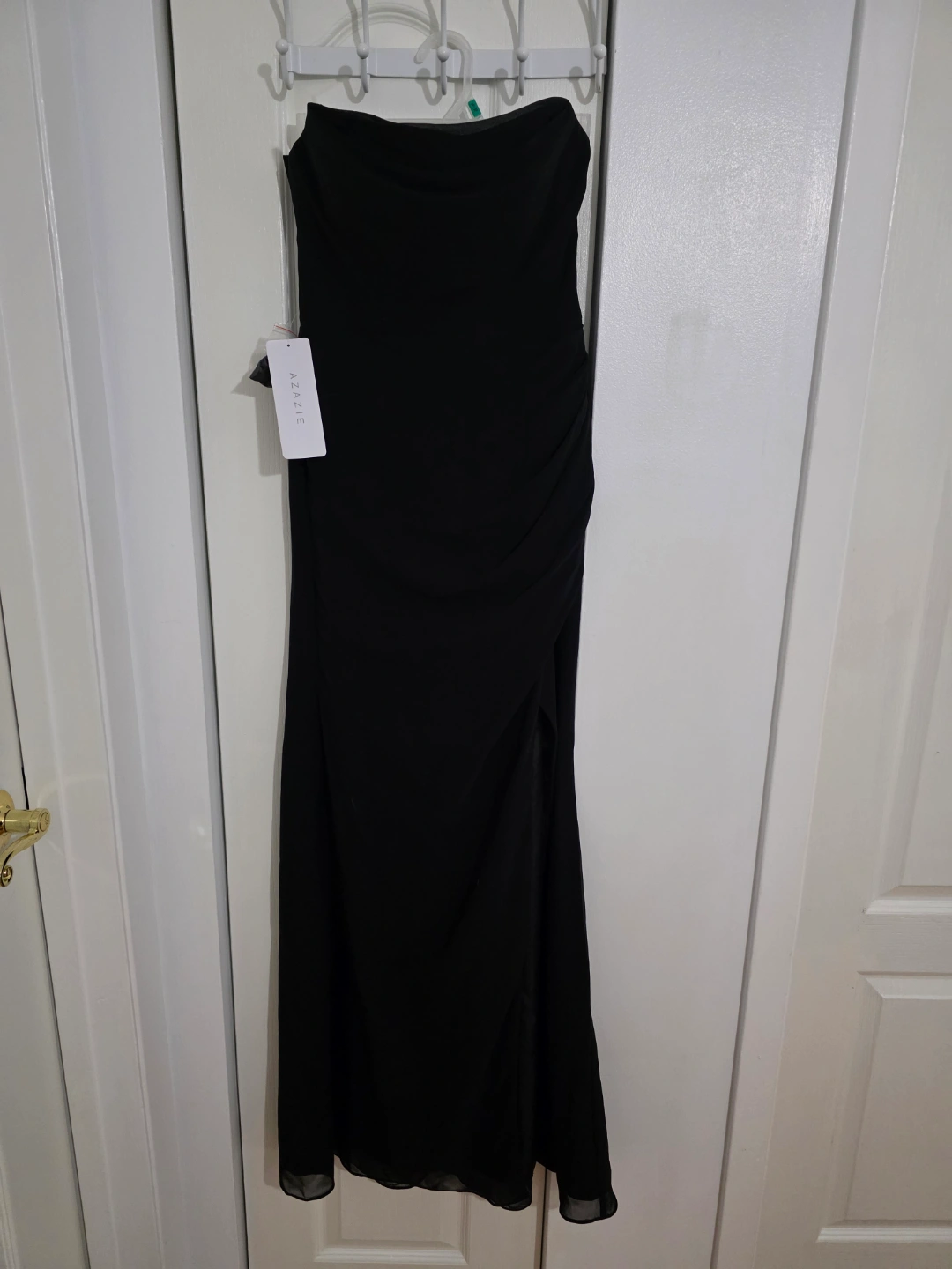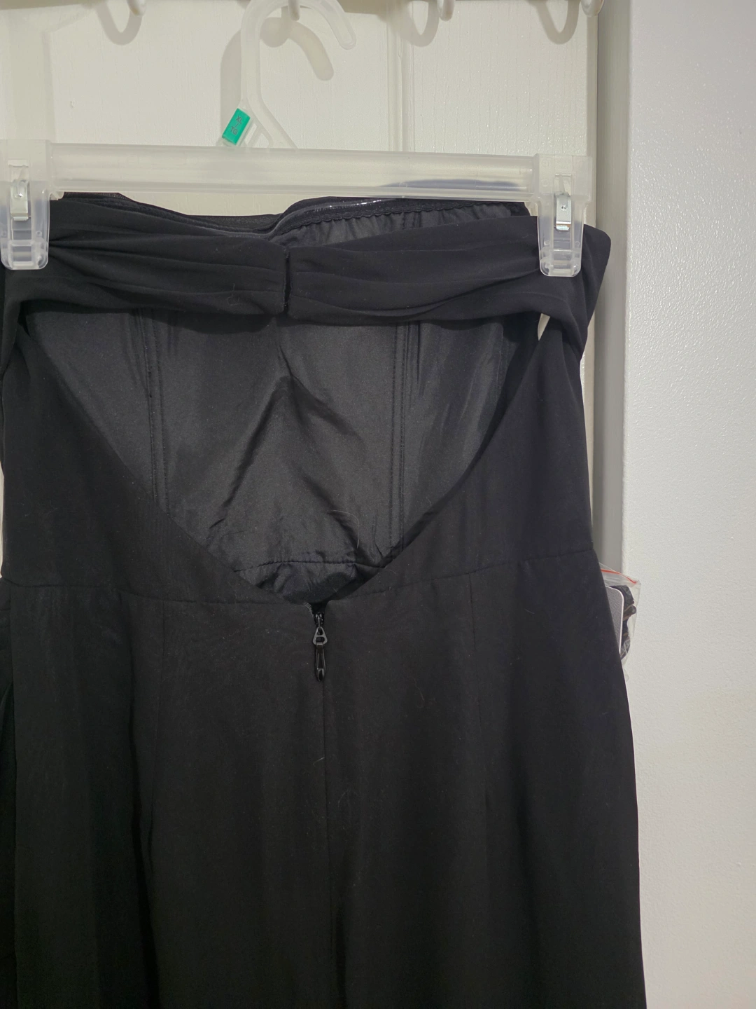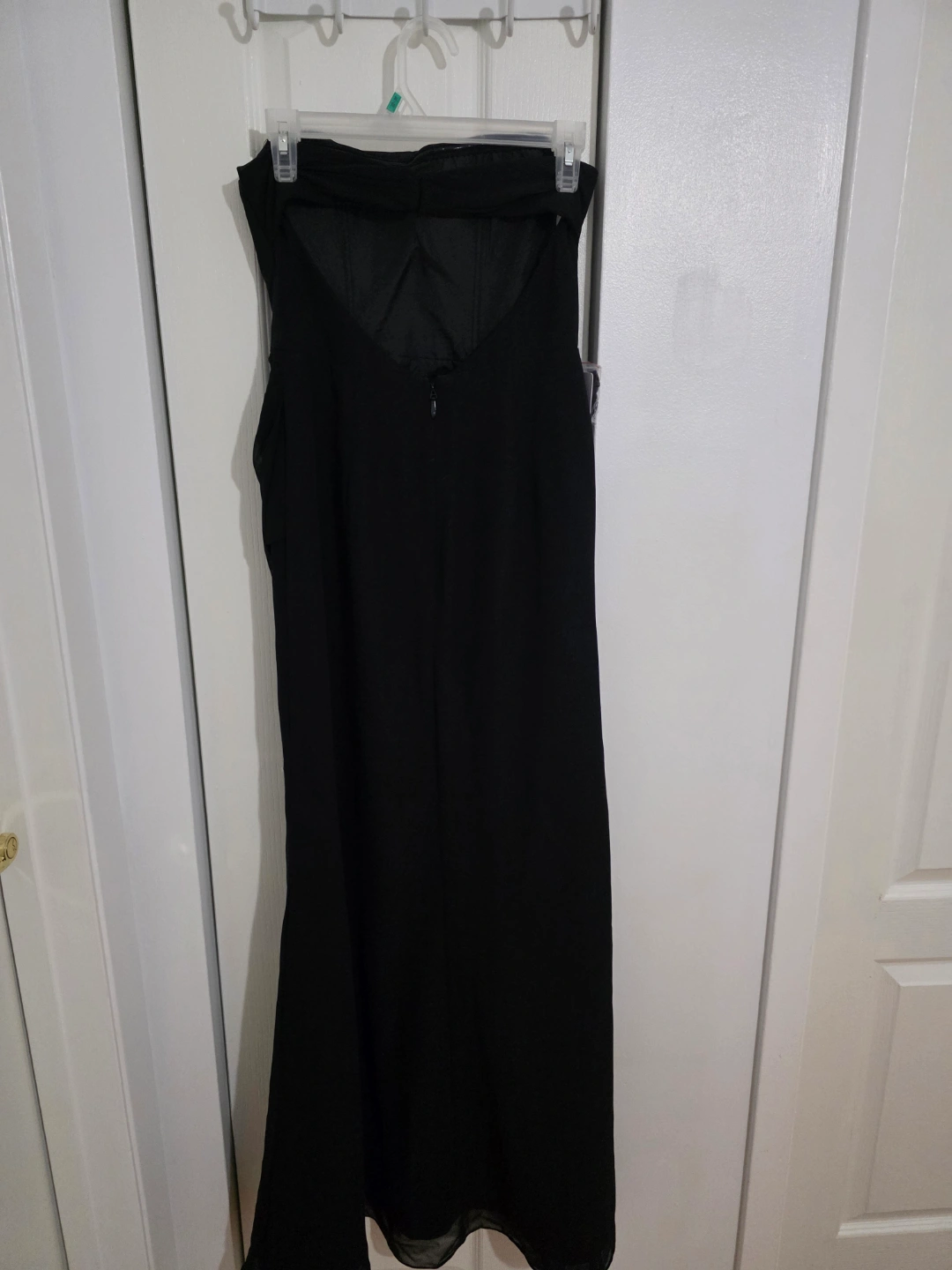 Elegant black strapless dress. Floor-length and a thigh-high slit. Features a sweetheart neckline and a back zipper. Great for special occasions.