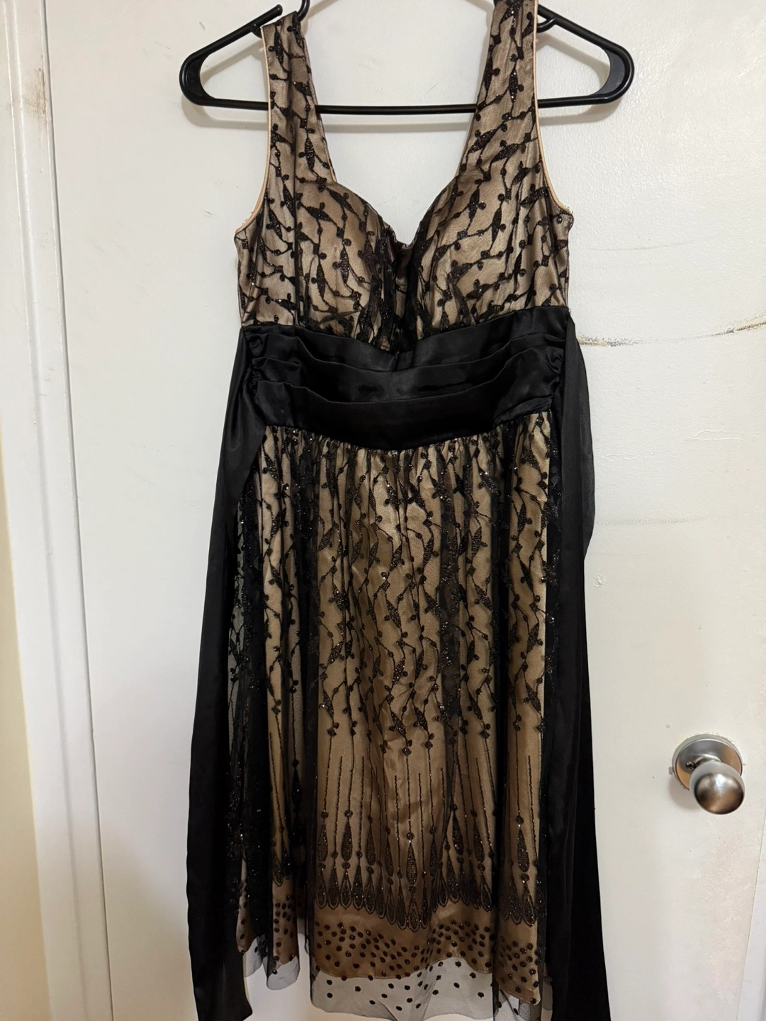 Beautiful black and gold cocktail dress. Features delicate lace overlay, black satin waistband and ribbon. V-neckline. Great for parties or special occasions. Size 6