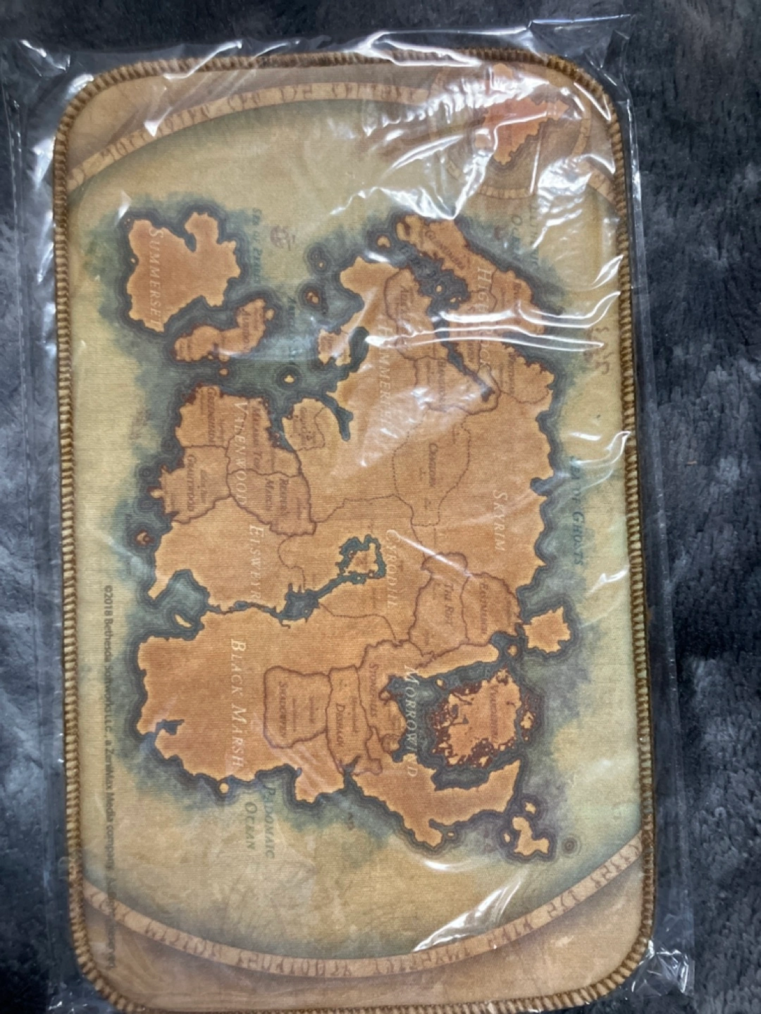 New mousepad featuring a map of Tamriel from the Elder Scrolls Online. Beige coloured fabric with brown stitching. Packaged in plastic.