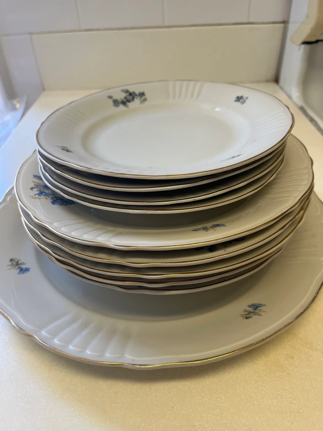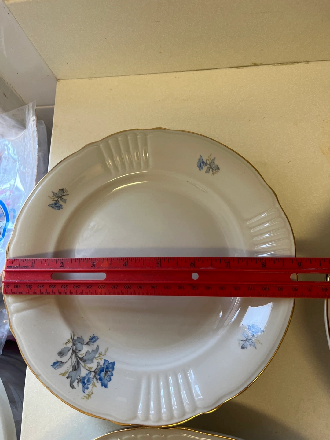 Set of vintage porcelain dinner plates. Features blue floral design and gold trim. Various sizes included. Excellent condition.