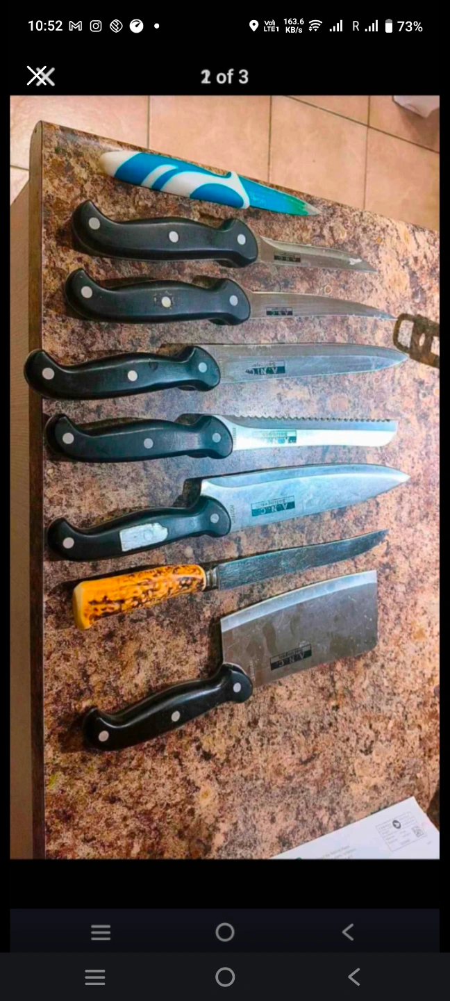 153Set of eight knives. Includes various blade types. Black handles. One knife has a unique handle.