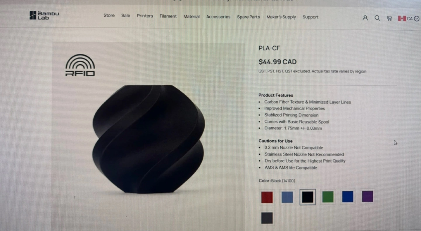 Bambu Lab PLA-CF Filament - 1kg Spool - Black