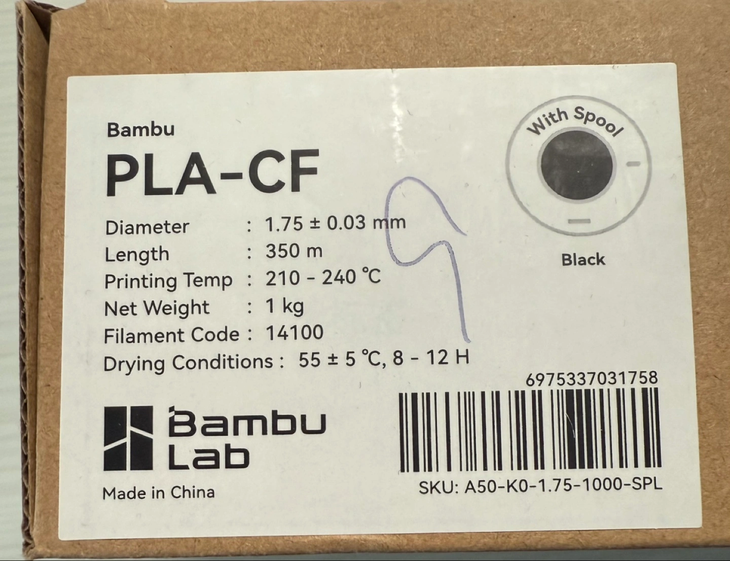 1 kg spool of black PLA-CF filament. Package opened and loaded once before realizing I purchased the wrong type of filament for my printer.