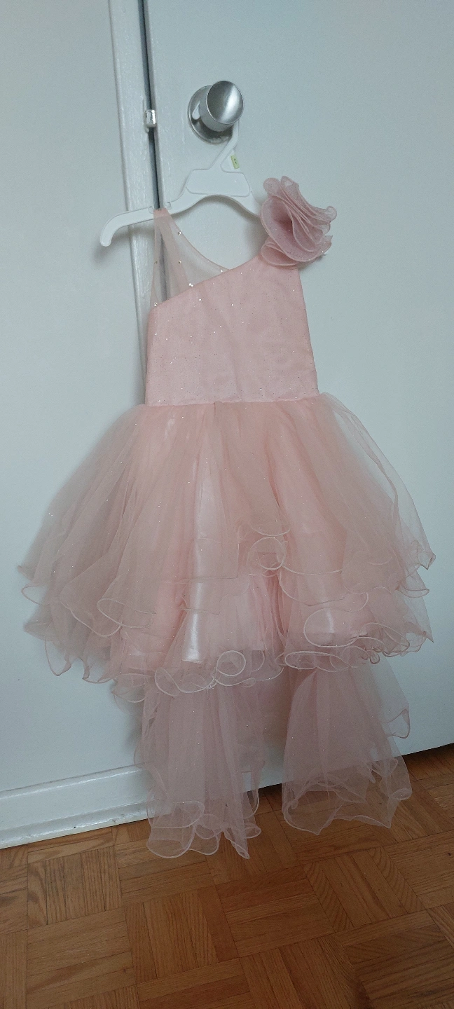 Beautiful blush pink dress. One-shoulder design. Layered tulle skirt. Flower embellishment. Perfect for a special occasion.