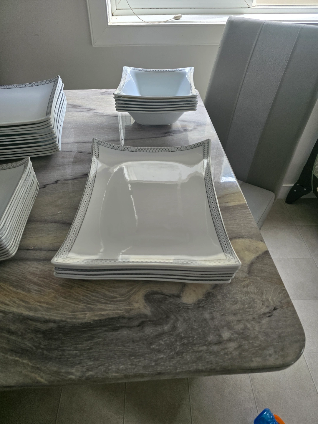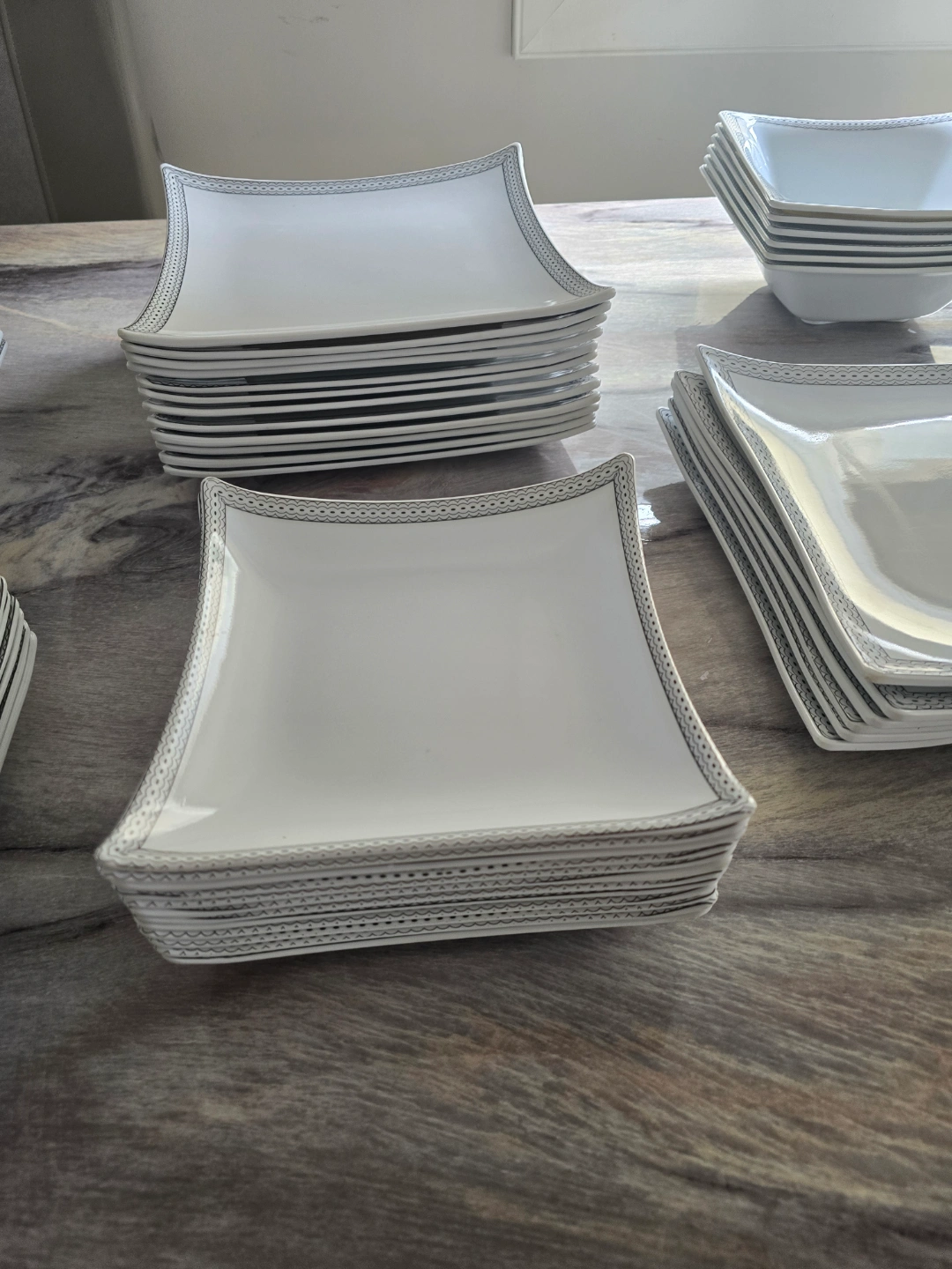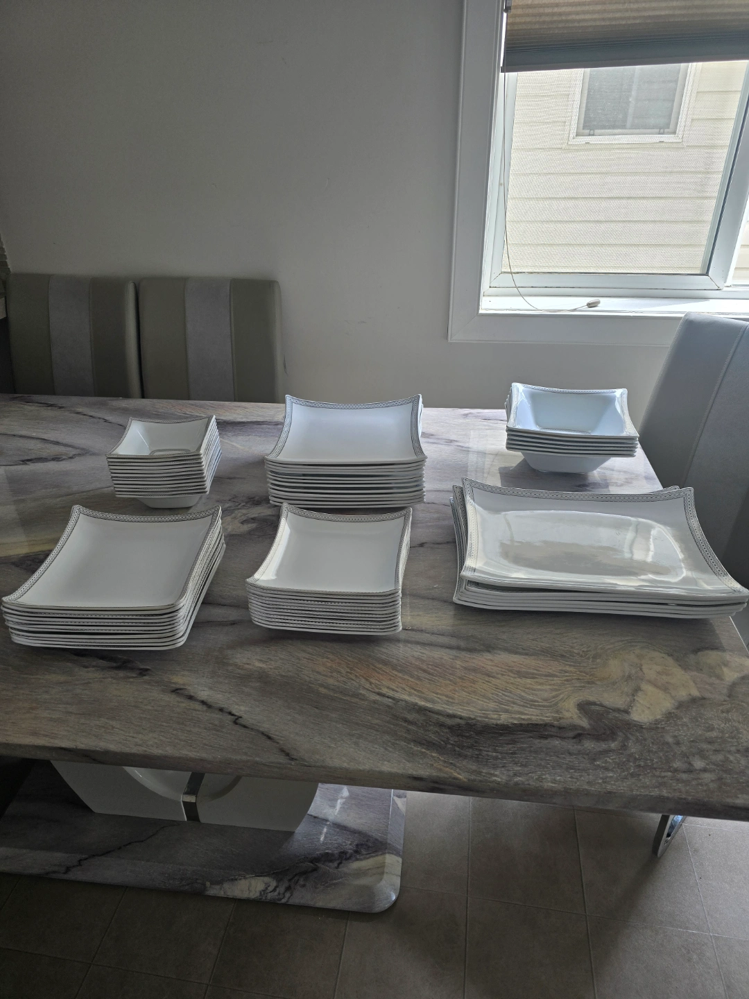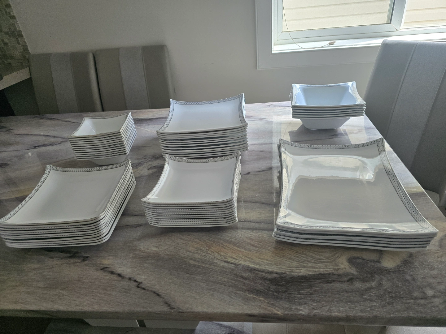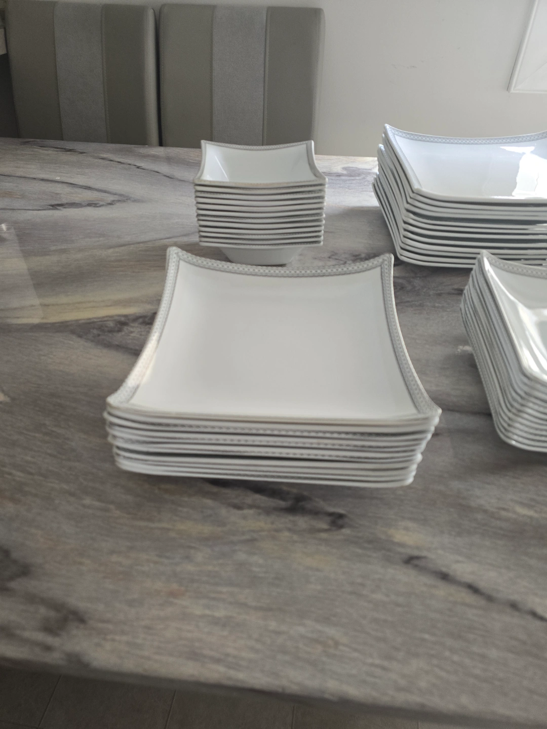 Beautiful white dinnerware set. Includes plates, bowls, and serving platters. Silver detailing around the edges. Perfect for dinner parties or everyday use. 60 pcs